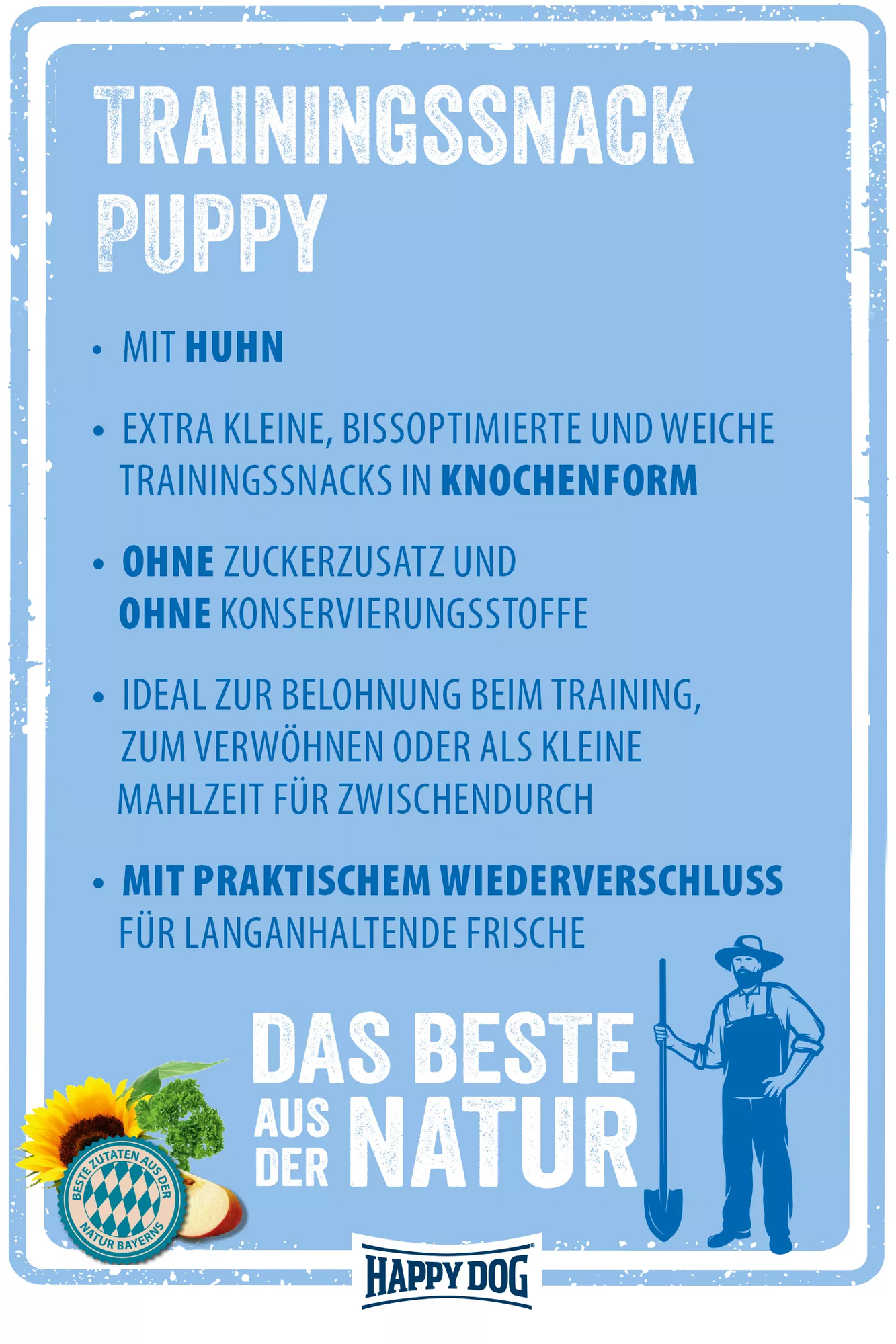 These delightful mini training snacks are specially formulated for puppies from the 6th week of life. The tasty snacks exclusively use natural ingredients sourced from the Bavarian region, combining delicious chicken with wholesome rice.