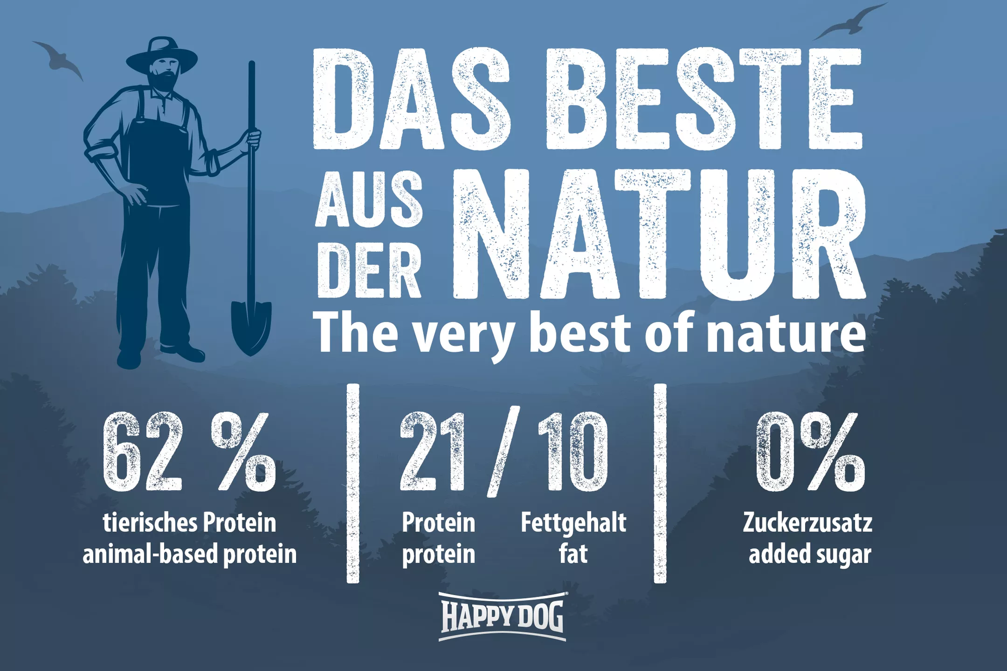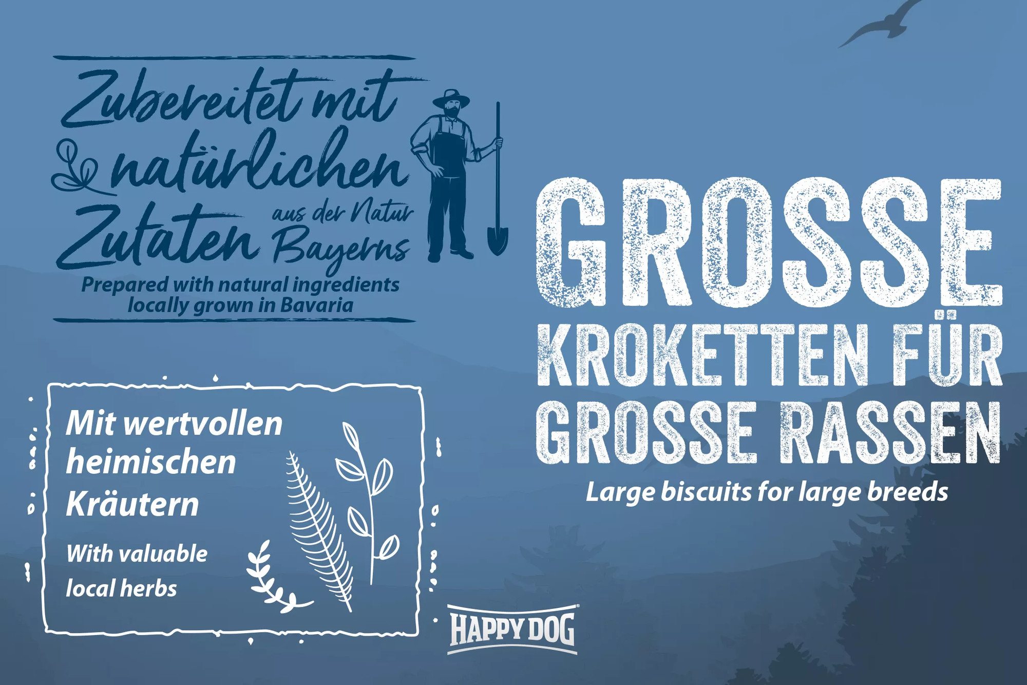 The large croquettes and the energy requirement in Happy Dog NaturCroq XXL have been adapted precisely to the needs of large dog breeds (+26 kg). As you would expect from this product line, the XXL croquettes also provide dogs with a high protein content - a whopping 61% animal protein. The recipe combines easily digestible poultry and valuable wholemeal with succulent herbs and ensures a moderate protein and adjusted fat content. Because your furry friend deserves the best quality and balanced flavour at every meal!