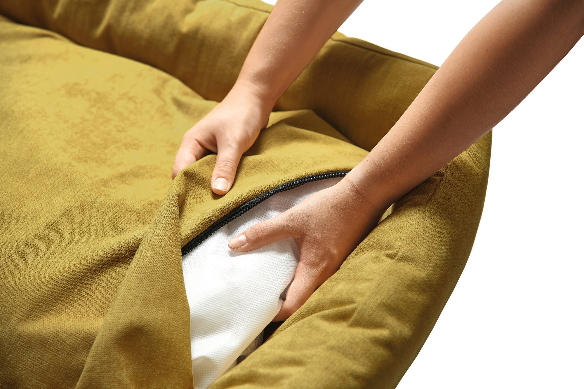 The EIBY dog sofa adds elegance and style to your home. The hard-wearing textured fabric is equipped with innovative EASY CLEAN technology. Thanks to nanoparticles, even stubborn dirt does not penetrate deep into the fabric. With a little water and, if necessary, a mild detergent, stains are removed in seconds. This keeps the dog sofa hygienically clean for a particularly long time - a more efficient and eco-friendly method than washing the entire cover.