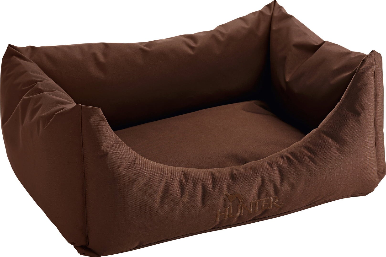 The simple dog bed with discreet HUNTER embroidery is perfect for indoor and outdoor use. The fluffy filling and high edge guarantee comfortable and safe resting. The edge is flattened at the front to make it easier for the dog to get in and out.