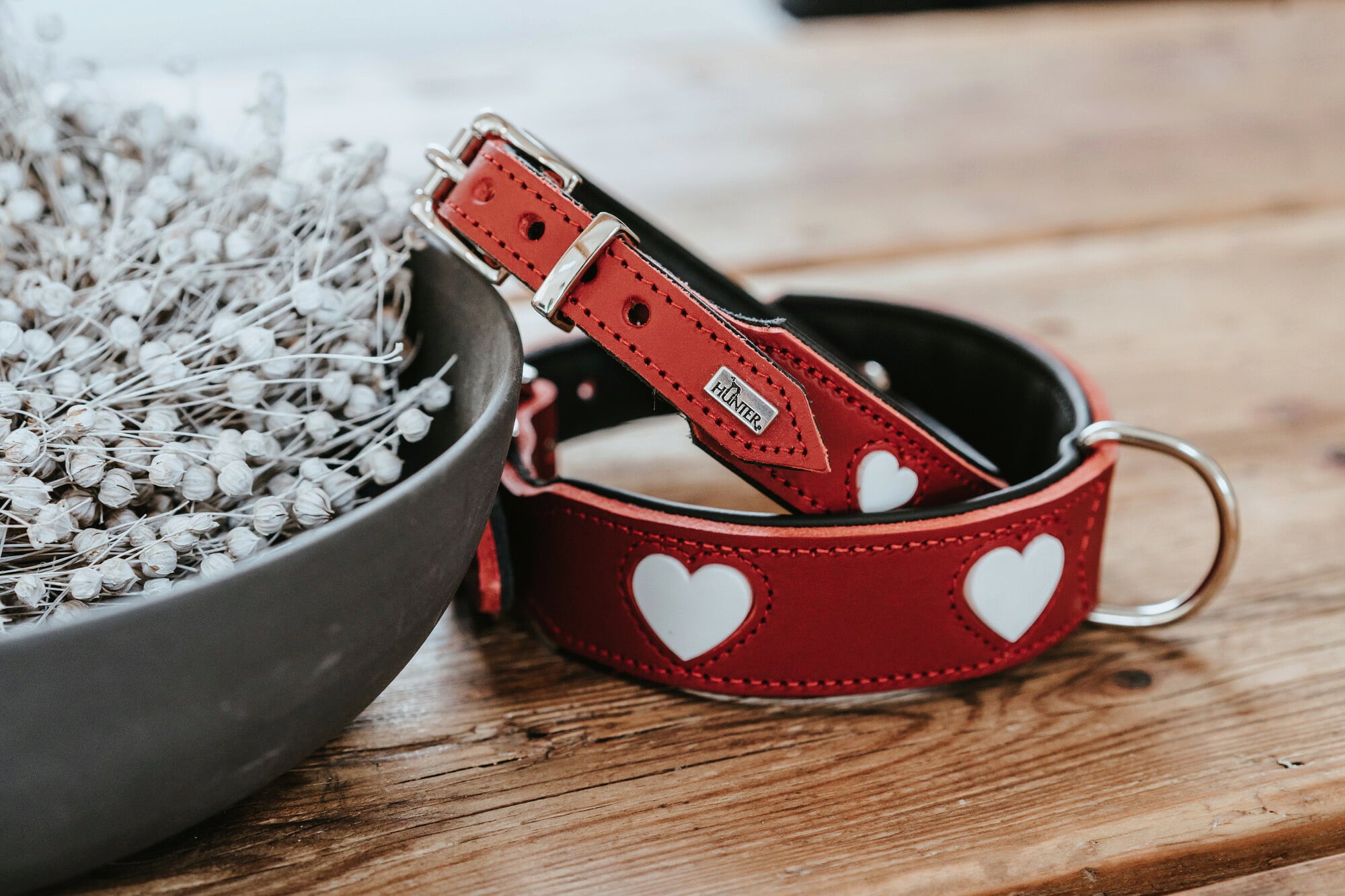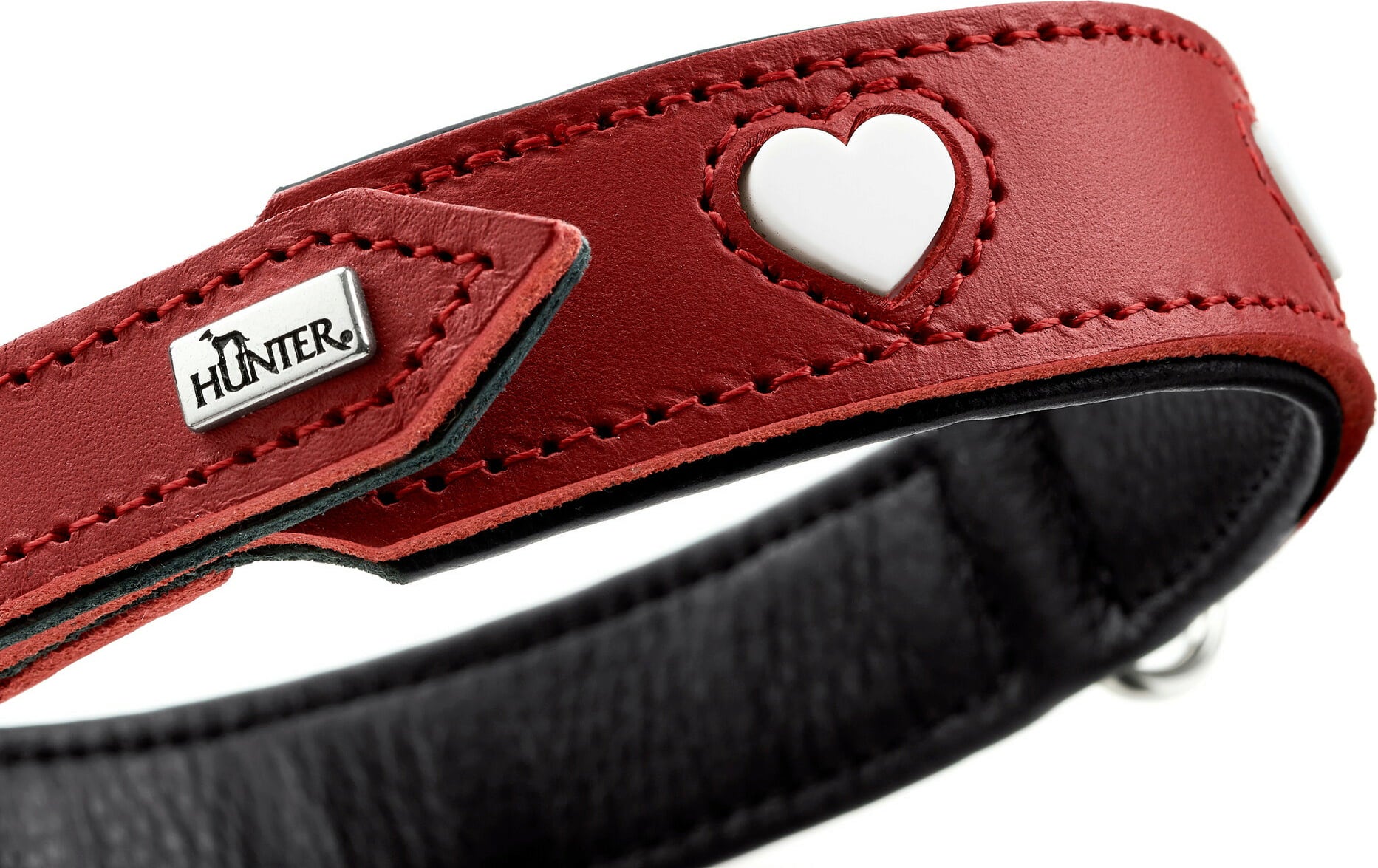 Playful, yet pretty cool - with the "Love" collar, HUNTER combines its passion for perfect craftsmanship, high-quality materials and unique design: the upper and lower material is made of cowhide, which is lined with particularly soft cowhide nappa leather. The hearts are elaborately handcrafted by a Bielefeld manufacturer and are individually edged and sewn.