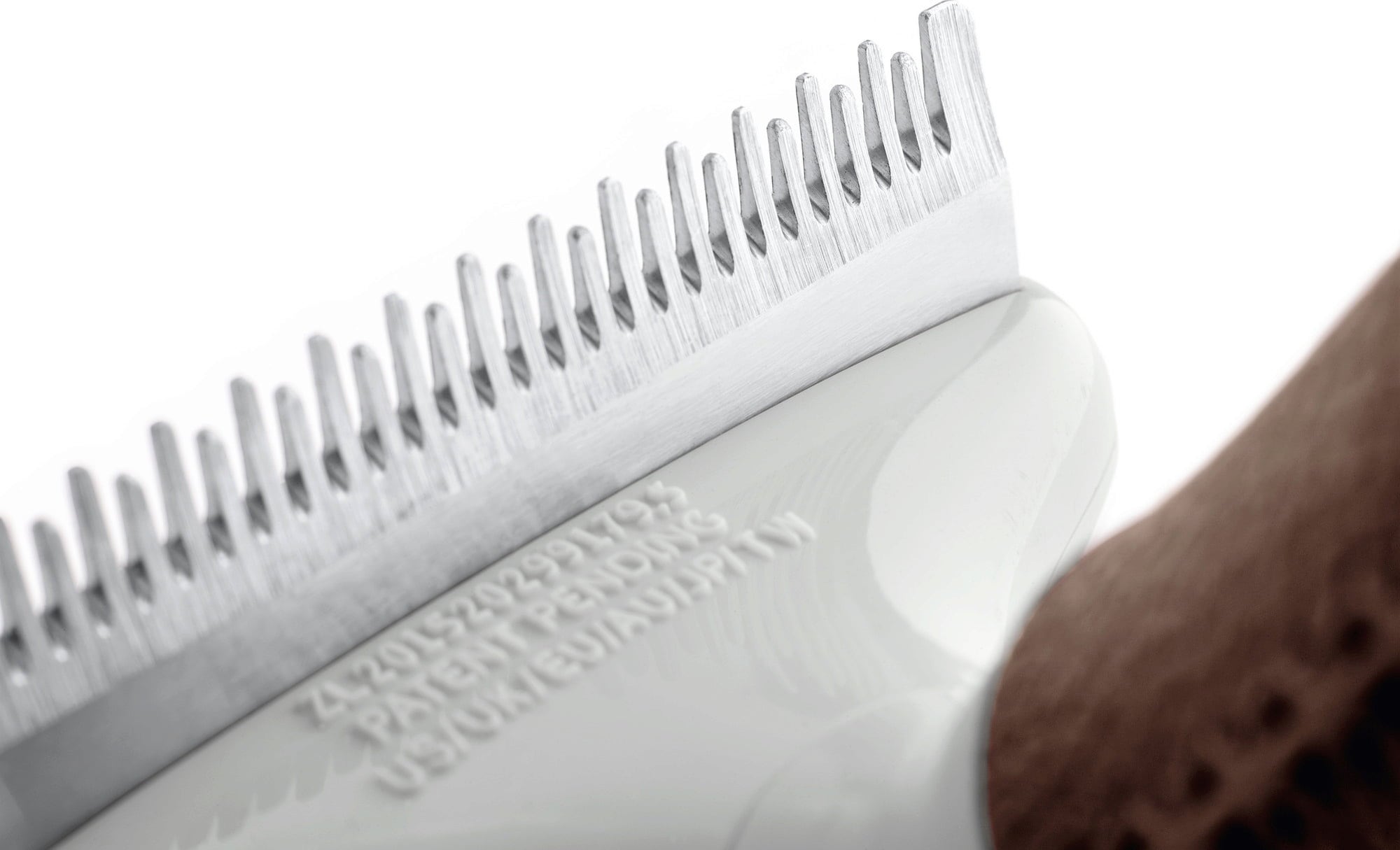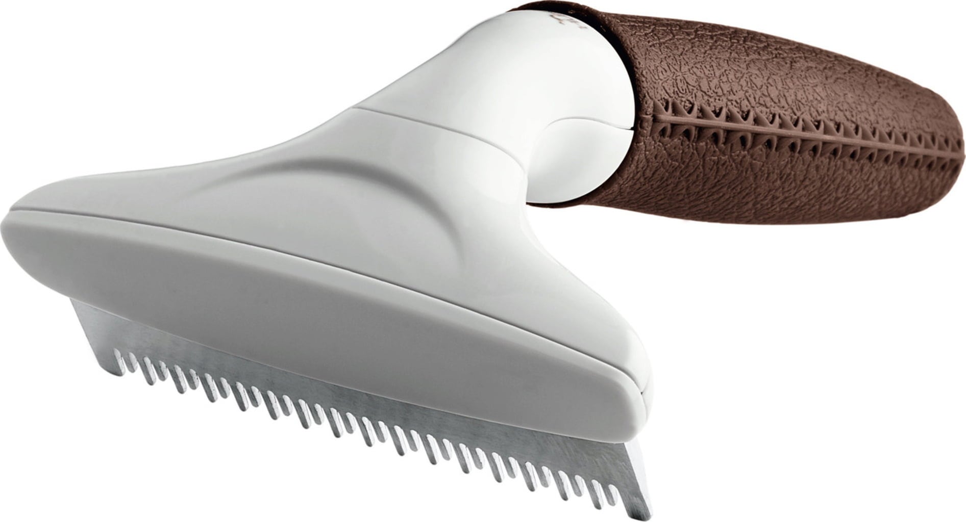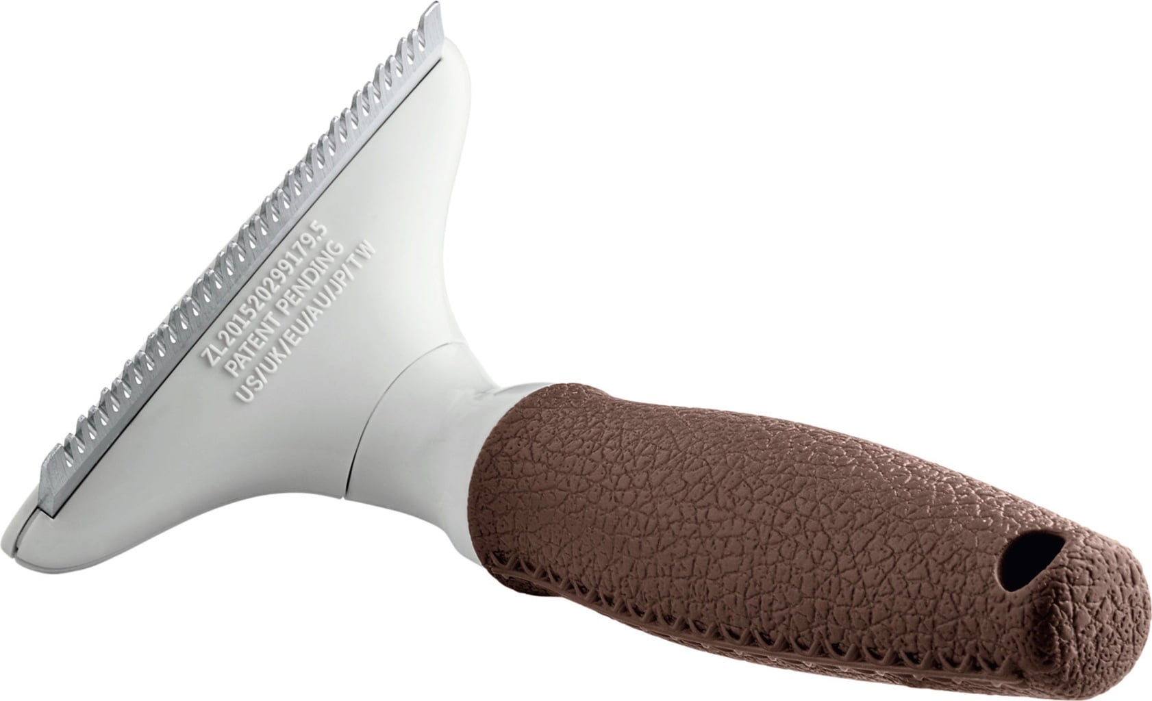 The key to a radiant, shiny coat is the innovative blade of the Spa trimming currycomb. Made from high-quality stainless steel, this brush effortlessly removes loose hair and dandruff from both the topcoat and undercoat, making it particularly effective for medium to long-haired dogs. Its ergonomically shaped handle ensures a non-slip grip and provides extremely comfortable handling.