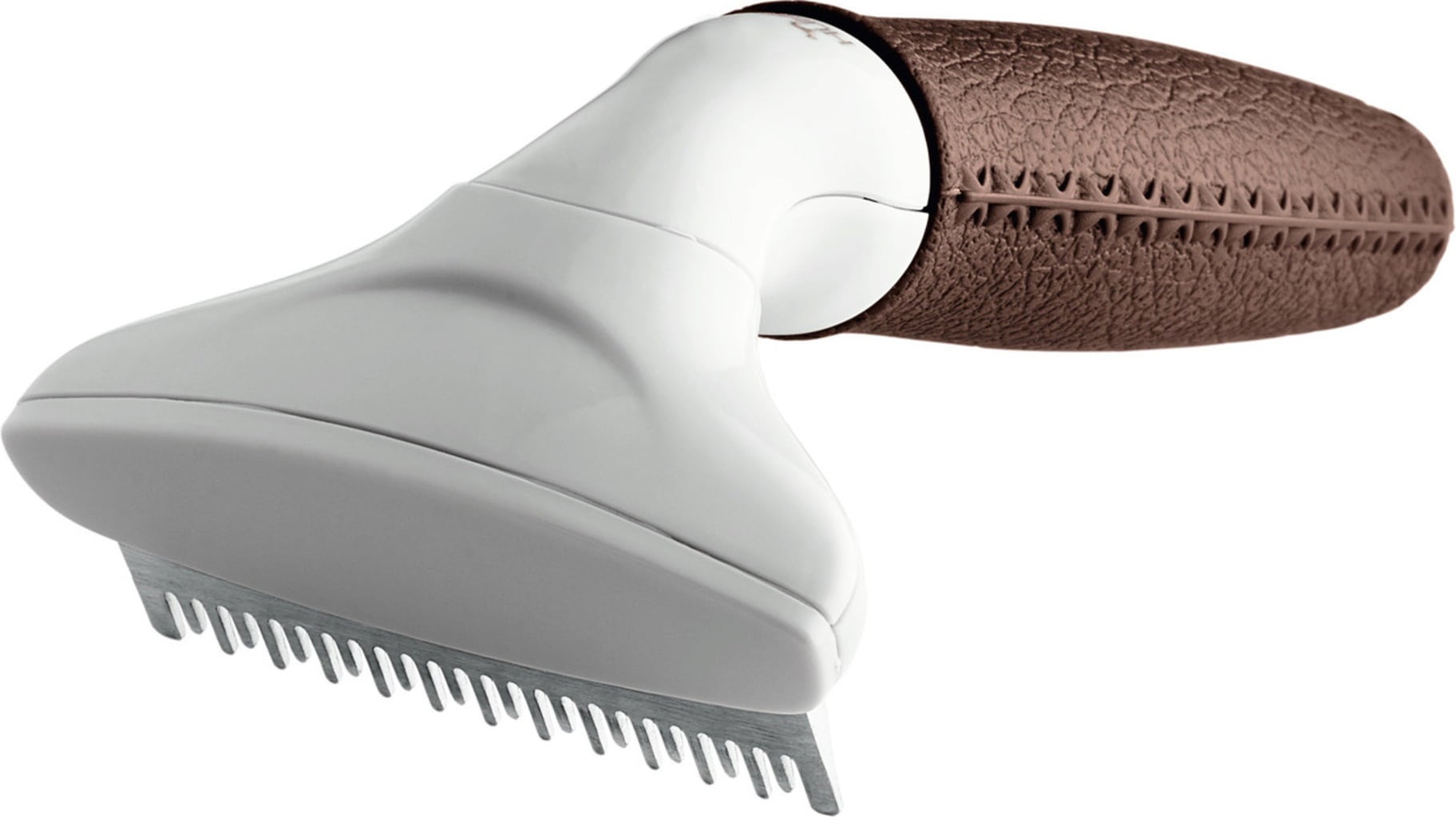 The key to a radiant, shiny coat is the innovative blade of the Spa trimming currycomb. Made from high-quality stainless steel, this brush effortlessly removes loose hair and dandruff from both the topcoat and undercoat, making it particularly effective for medium to long-haired dogs. Its ergonomically shaped handle ensures a non-slip grip and provides extremely comfortable handling.