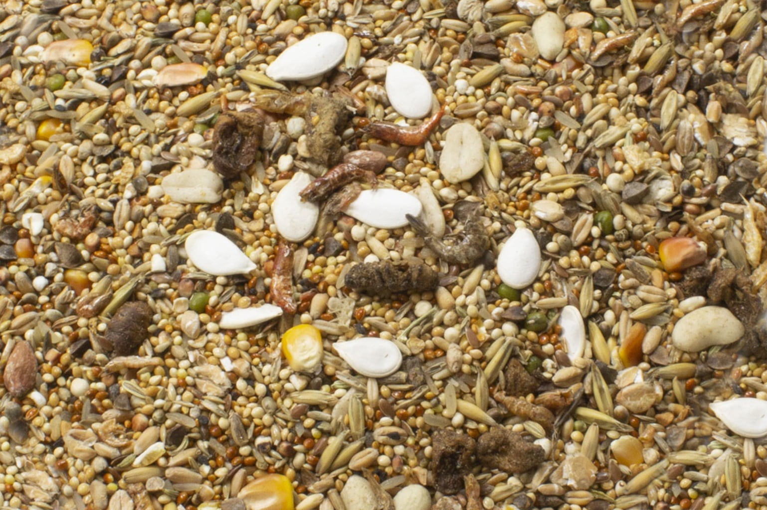 Silver millet, La Plata millet, Manna millet, Oats, Corn, wheat, Peanuts, Wheat Flakes, Rice, Canary grass seed, puffed wheat, Red mohair millet, Buckwheat, Grass seed, Senegal millet, 3 % Shrimps, Wild seeds (consisting, among other things, of Alexandrian clover, Rumex obtusifolius, Daisy, Chenopodium album, Millet, Shepherd's purse, Camomile, knotweed, cornflowers, Saltbush (Atriplex), Poppies, Red fescue, Spinach seeds, Pansies, chickweed, plantain, Perennial ryegrass, welsh Ryegrass, Poa pratensis, Wind grass), Linseed, Farro, Sorghum, 2 % Silkworm pupae, Mung beans, Milo grains, Hemp seed, Milk thistle seed, Peeled pumpkin seeds, Fennel seeds, Rosehip seeds , Black cumin