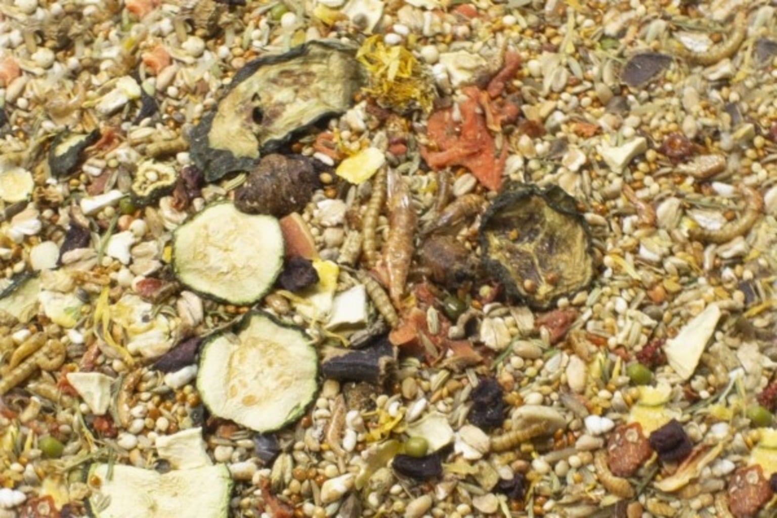 Manna millet, Silver millet, La Plata millet, Dried carrots, Canary grass seed, Grass seed, wheat, Corn flakes, Wheat Flakes, puffed wheat, Sorghum, 2,8 % Parsnips, Wild seeds (consisting, among other things, of Alexandrian clover, Rumex obtusifolius, Daisy, Chenopodium album, Millet, Shepherd's purse, Camomile, knotweed, cornflowers, Saltbush (Atriplex), Poppies, Red fescue, Spinach seeds, Pansies, chickweed, plantain, Perennial ryegrass, welsh Ryegrass, Poa pratensis, Wind grass), Red mohair millet, Senegal millet, Milo grains, Rice, Beetroot, 1,7 % Linseed, Buckwheat, Dried carob, Milk thistle seed, Corn, Oats, 1,3 % Shrimps, Fennel seeds, Mung beans, Rosehip seed, Hemp seed, 1 % Gammarus, 1 % Mealworms, Fenugreek seeds, Hulled sesame seeds, Amaranth, Blue poppy seeds, Calendula flowers, 1 % Parsley , 0,8 % Silkworm pupae, Peanuts, Tomatoes, 0,5 % Paprika, Zucchini, Cucumber, Black cumin, Dactylis glomerata seed, Timothy grass seed, Alfalfa seed, Dill seed, 0,2 % Yucca schidigera