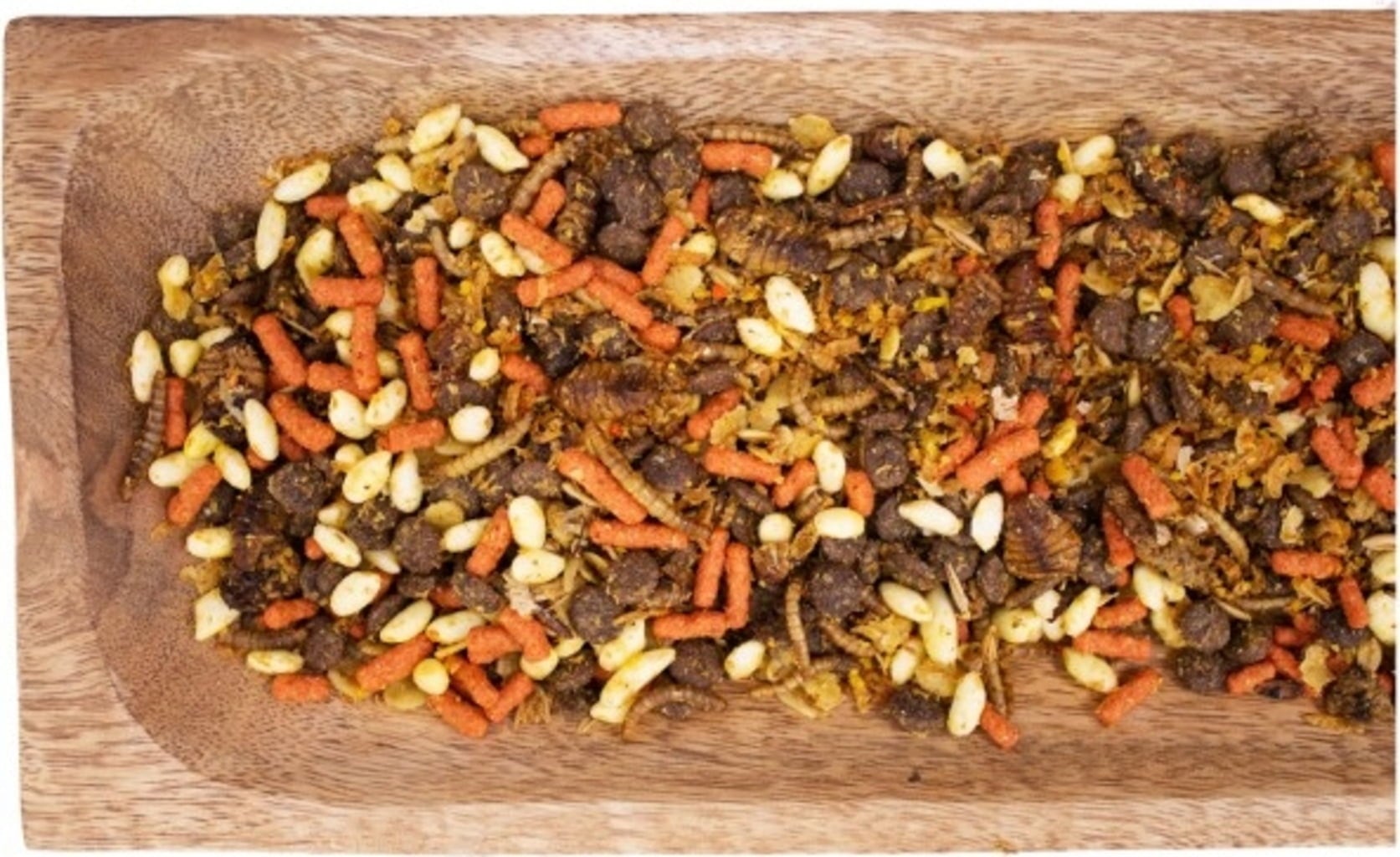 Extruded corn flour, 15 % Shrimps, 12,4 % Chicken, Rapeseed Oil, Lupine flakes, oatmeal, 5 % Silkworm pupae, Puffed rice, Whole Egg Powder, 3 % Mealworms, Dried carrots, Fish, Extruded wheat flour, Soy