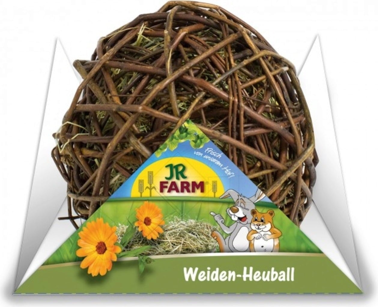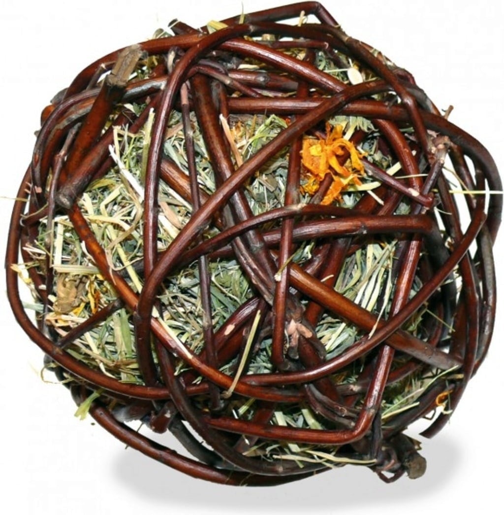 Let's play! Bring fun to your small pet's enclosure with this ball and banish boredom for good. Made from untreated willow wood, it is perfect for both playing and nibbling, offering a welcome change of pace. But what's that delightful smell? Packed inside the ball is a generous amount of wonderfully fragrant mountain meadow hay and marigolds, not only delicious but also offering extra fun for play and nibbling.