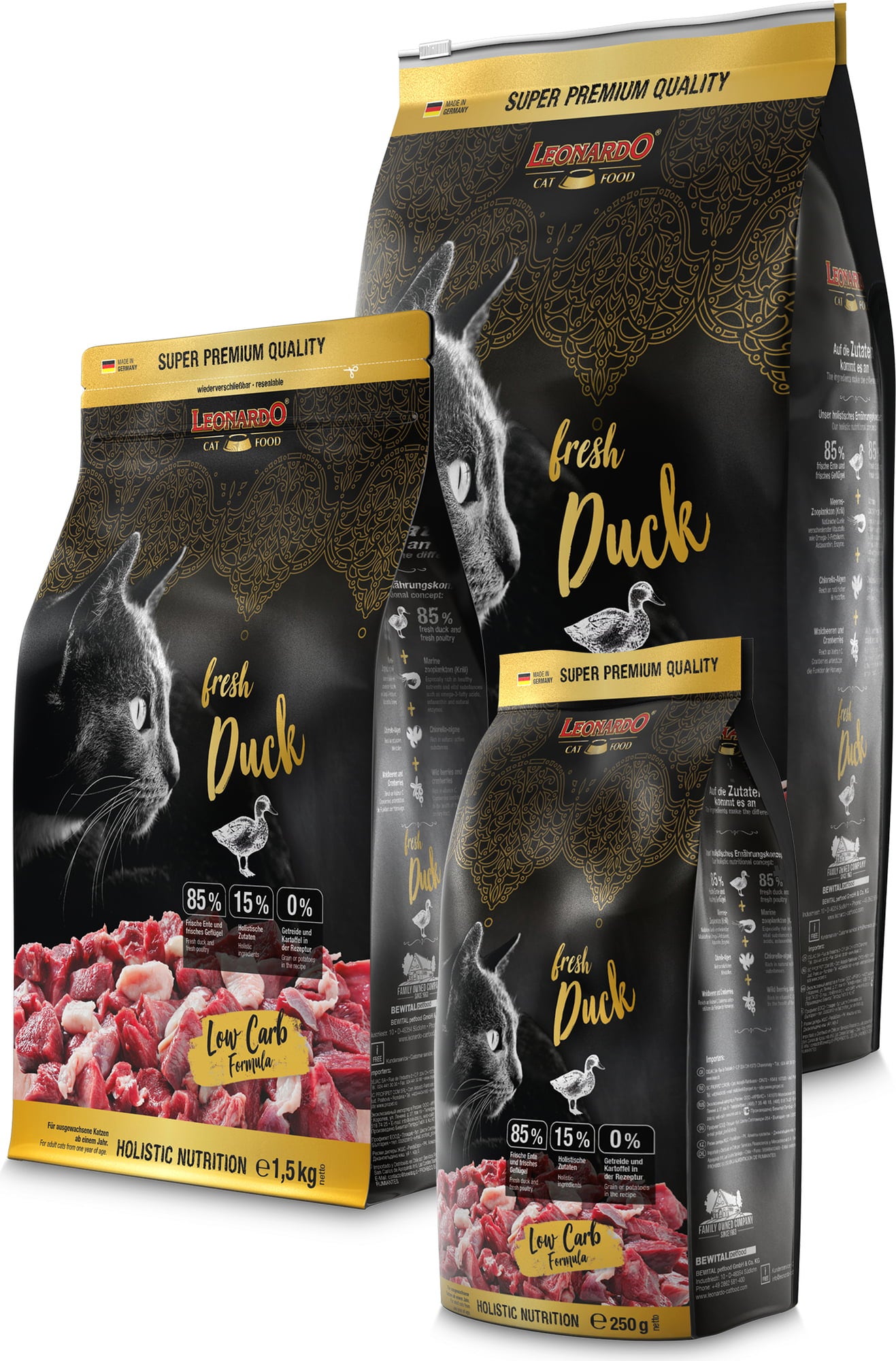Extra fresh duck and poultry meat are complemented by select plant-based ingredients like vegetables, herbs, berries, and chlorella algae. This holistic pet food concept avoids grains and potatoes, making it highly digestible for hungry cats. Instead, this diet features a low-fat, low-starch formula with high-quality protein sourced from peas and amaranth.