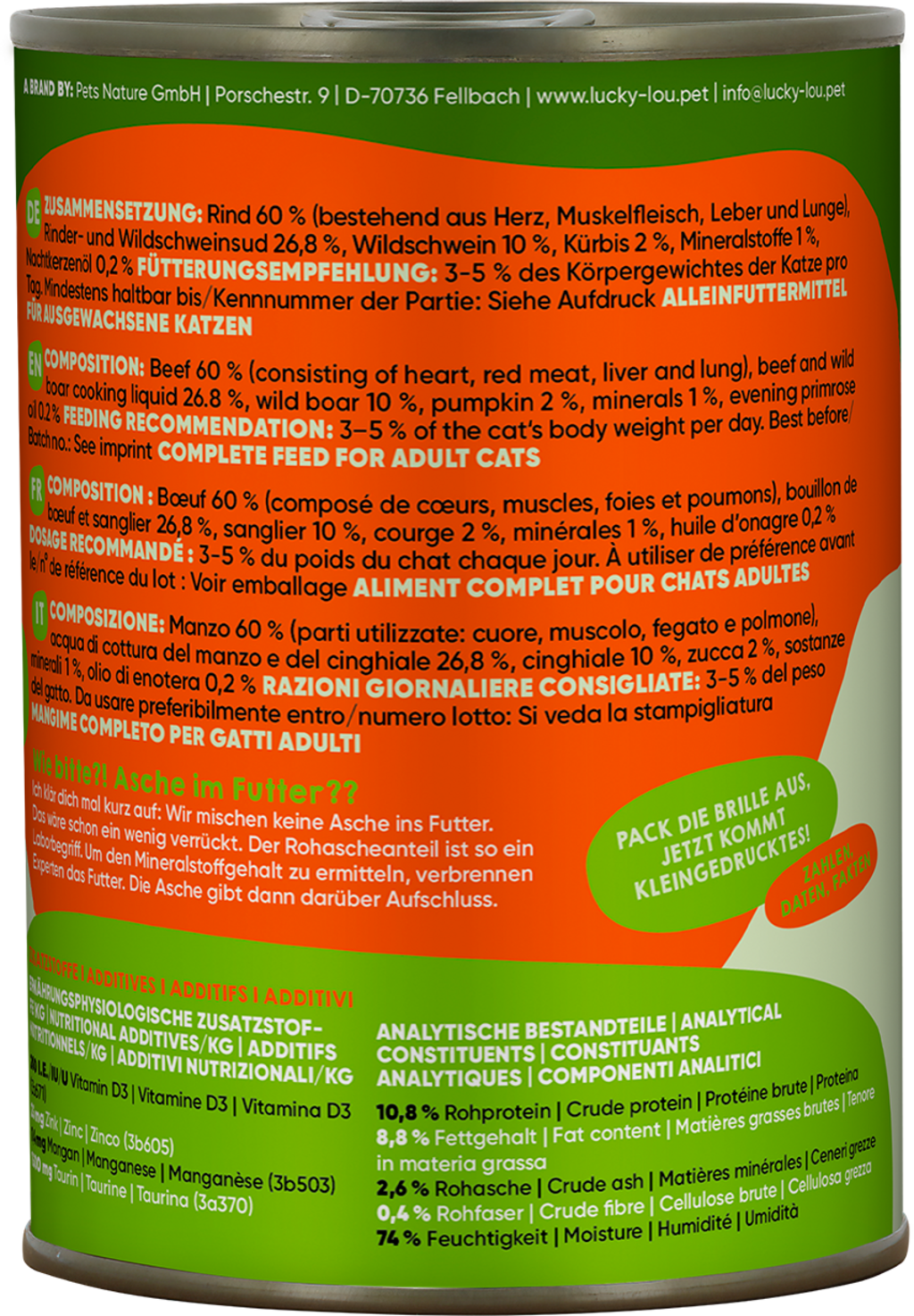 60 % Beef (Heart, Muscle meat, Liver, Lung), 26,8 % Beef and wild boar broth, 10 % Wild boar, 2 % Pumpkin, 1 % Minerals, 0,2 % Evening primrose oil