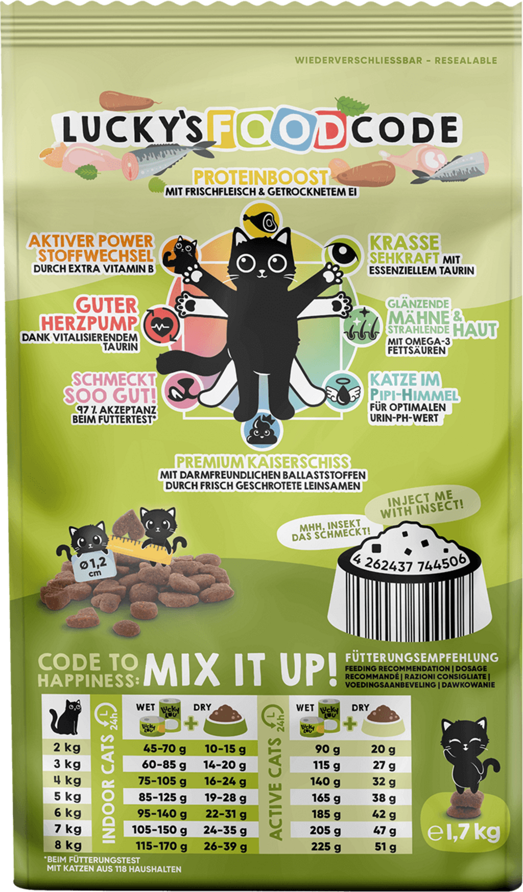 Lucky Lou Food Code is peak dry food, as it not only tastes irresistibly crunchy and delicious, but also provides your cat with valuable nutrients appropriate for their age. Inspired by the perfect proportions of Leonardo da Vinci's vitruvian man, the balanced recipe of this dry food offers 8 benefits per variety, which holistically pamper your cat from head to toe.