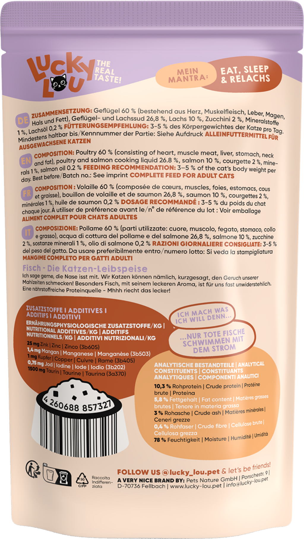 English reviews written for Lucky Lou Adult Poultry & Salmon Pouch by Lifestage