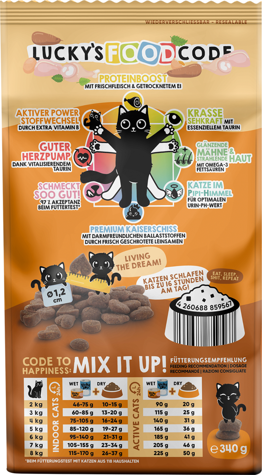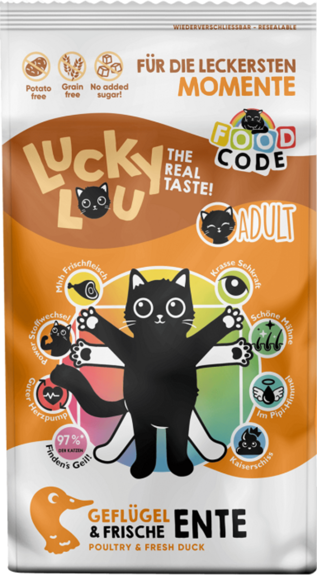 Lucky Lou Food Code is peak dry pet food, as it's not only irresistibly crunchy and delicious, but also provides your cat with valuable age-appropriate nutrients. Inspired by the perfect proportions of Leonardo da Vinci's Vitruvian Man, the balanced formula of this dry food offers 8 benefits per type, which holistically pamper your cat from head to paw.