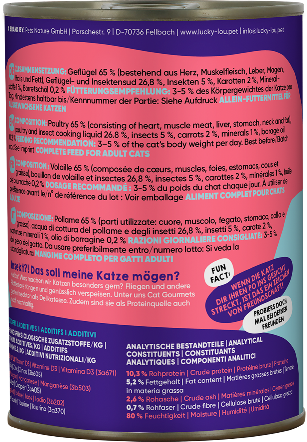 65 % Poultry (Heart, Muscle meat, Liver, Stomach, Neck, Fat), 26,8 % Poultry and insect broth, 5 % Insects, 2 % Carrots, 1 % Minerals, 0,2 % Borage oil