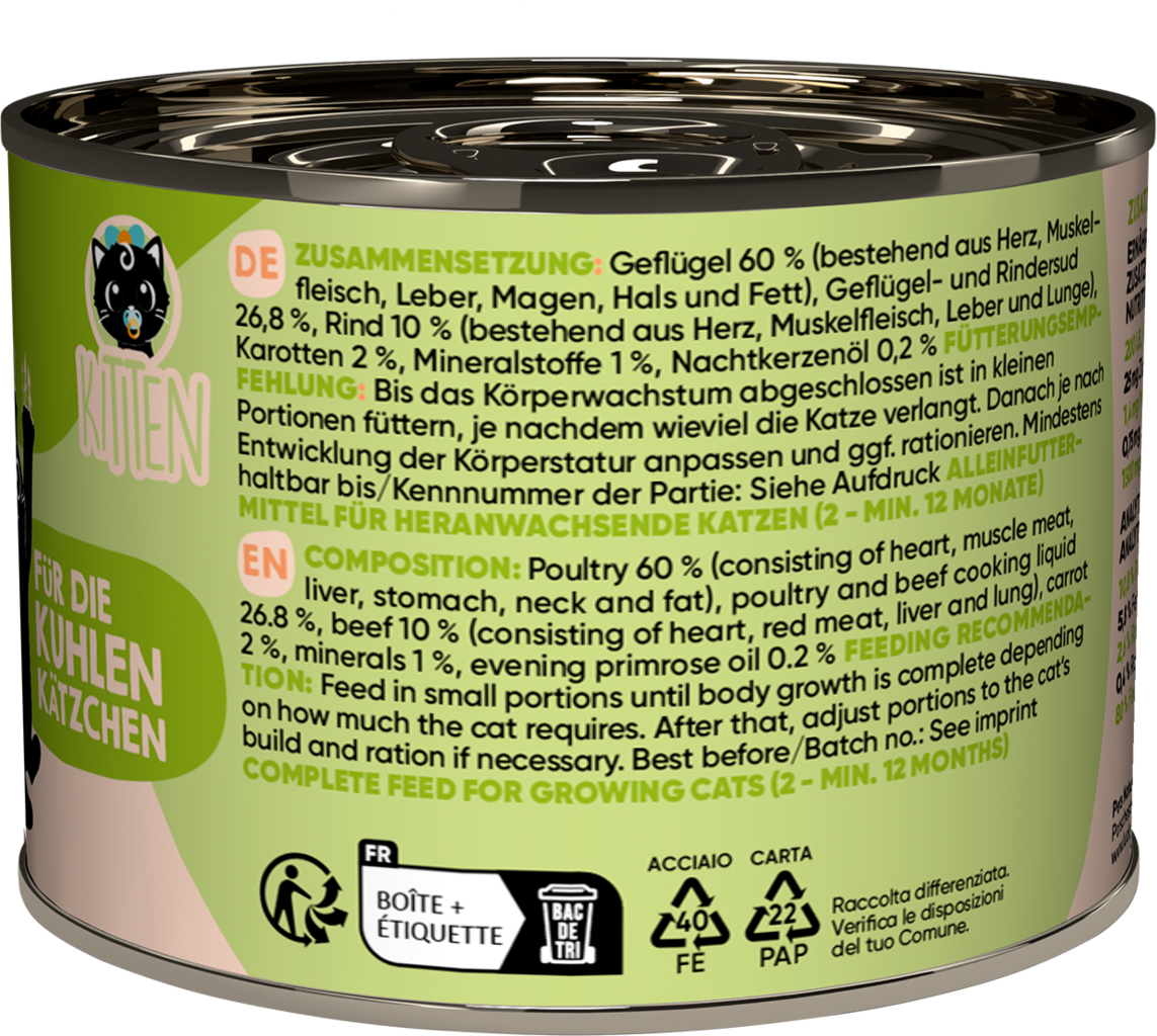 Attention cool cats! This wet pet food provides your kitten with all it needs every day, mirroring nature's best offerings. It's not only a top-notch nutritional foundation for a lively cat life, right from the start, but it's also irresistibly tasty. Your cat will prefer it over any mouse.