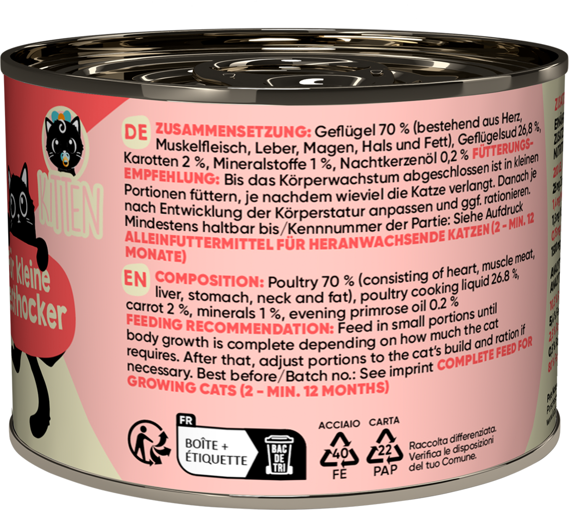 Attention cool cats! This wet food provides your kitten with everything it needs each day, just as nature intended. It is not only a high-quality nutritional foundation for a healthy cat life from the very start but also tastes incredibly delicious. Your cat will happily forget about mice for this meal.