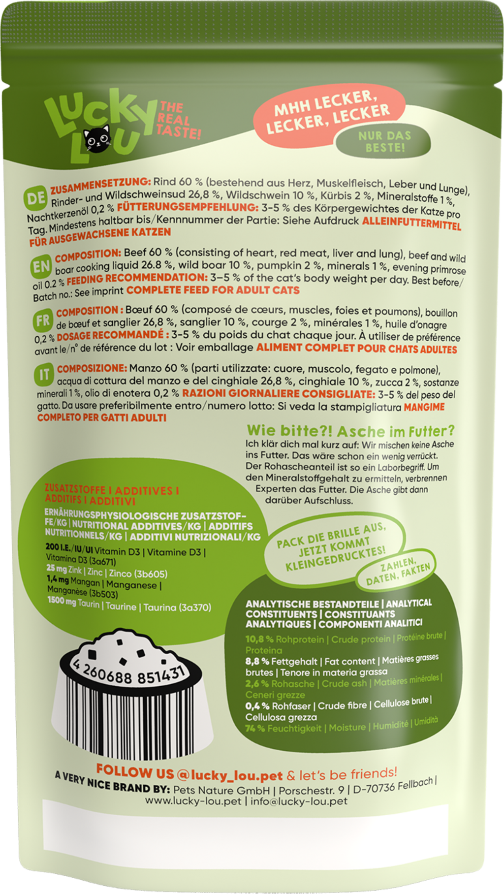 English reviews written for Lucky Lou Lifestage pouch adult beef & wild boar