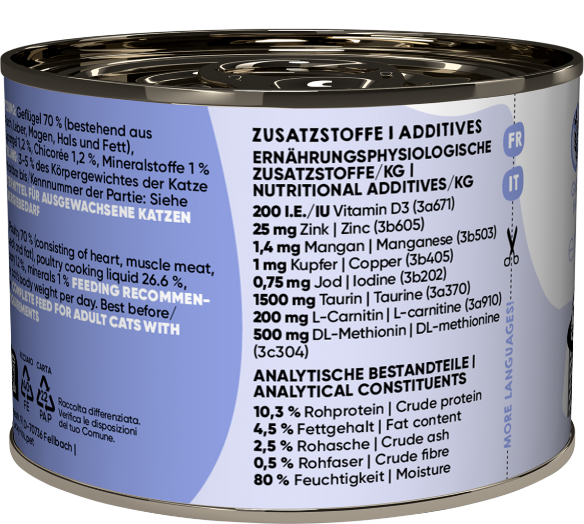 70 % Poultry (Heart, Muscle meat, Liver, Stomach, Neck, Fat), 26,6 % Poultry stock, 1,2 % Asparagus, 1,2 % Chicory, 1 % Minerals
