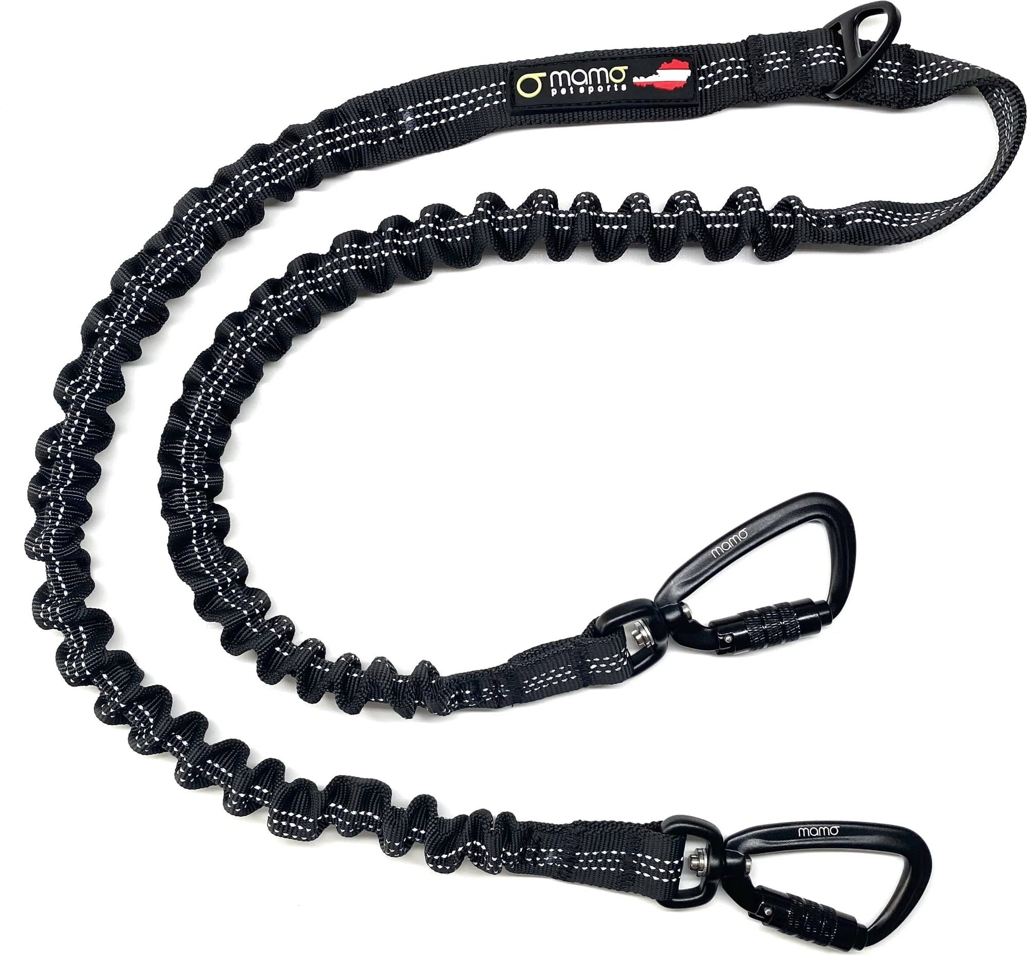 Mde in Austria since 2021, the new leash series by mamopets is ideal for numerous outdoor activities with your dog. The twin leash connector is compatible with all mamo leashes and is equipped with two self-locking aluminium carabiners with integrated swivel joints. Woven light strips ensure high visibility in the dark while the two symmetrical line branches distribute the pull on the rear, centred leash. Both leashes have a length of 60 cm each and which can each be extended to about 80 cm with the integrated bungee section.