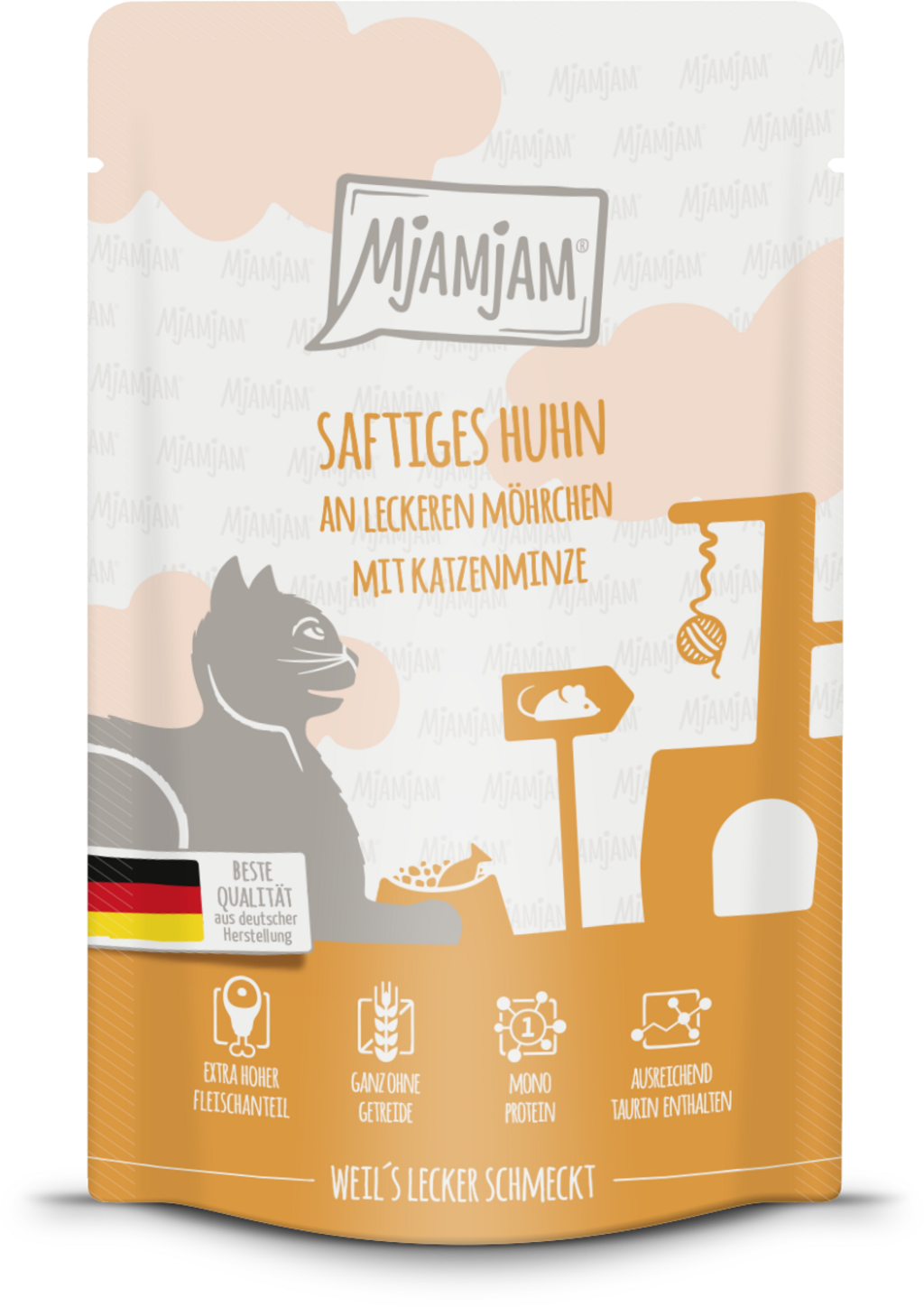 Mjamjam Portion Bags indulge your cat with rich flavours, exceptional quality, and a touch of love. Your little tiger will enjoy a wholesome meal made with fresh chicken, crunchy carrots, and a hint of catnip for an extra treat. Enriched with taurine, essential for feline health, it ensures your beloved companion has everything they need to thrive.
