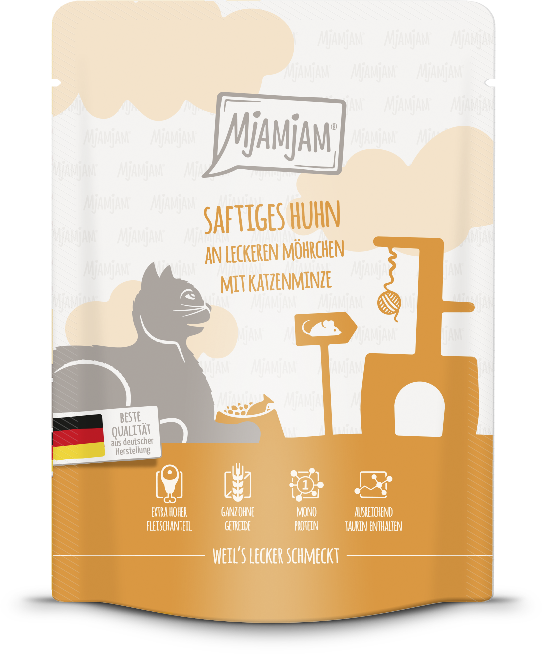 Mjamjam Portion Bags indulge your cat with rich flavours, exceptional quality, and a touch of love. Your little tiger will enjoy a wholesome meal made with fresh chicken, crunchy carrots, and a hint of catnip for an extra treat. Enriched with taurine, essential for feline health, it ensures your beloved companion has everything they need to thrive.