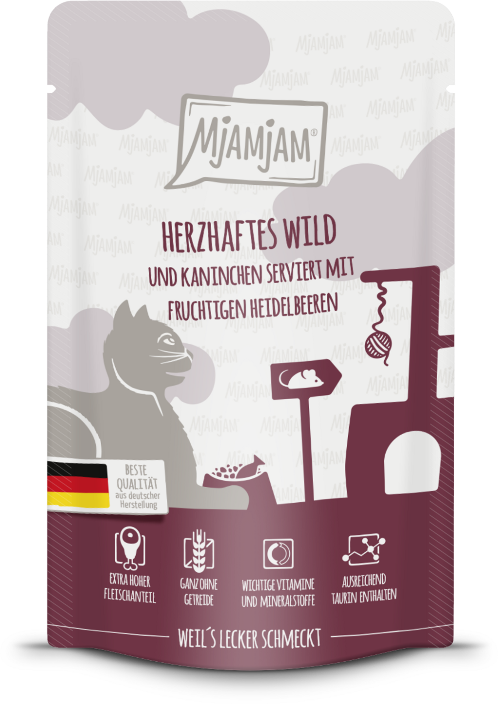 Mjamjam Portion Bags pamper your cat with rich flavours, premium quality, and a touch of love. Your little tiger will enjoy a wholesome meal crafted with fresh game meat, tender rabbit, and fruity blueberries. Enriched with taurine, essential for feline health, it ensures your beloved pet has everything they need to thrive.