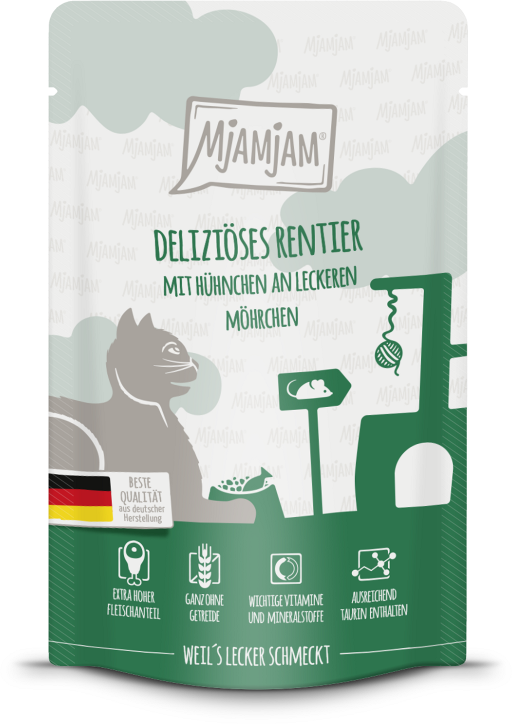 Mjamjam Portion Bags pamper your cat with rich flavour, exceptional quality, and a touch of love. Your little tiger will enjoy a wholesome meal made with fresh reindeer meat, tender chicken, and crunchy carrots, delivering a naturally delicious and nutritious experience. Enriched with taurine, an essential nutrient for cats, it ensures your beloved pet has everything they need to thrive.