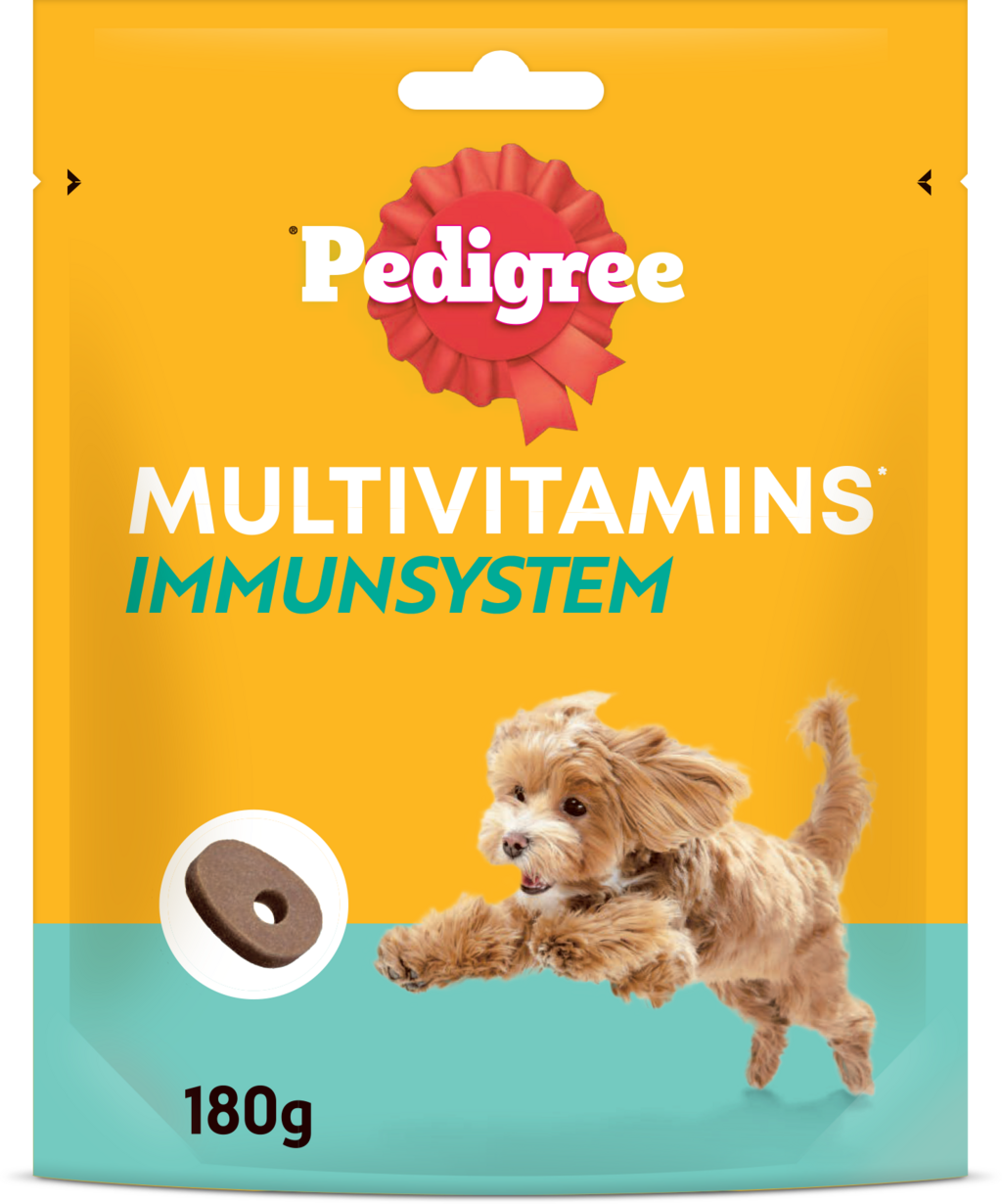Multivitamins Immune System from Pedigree is a supplementary food for adult dogs. The low-fat mix (less than 5 % fat) of vitamins, antioxidants and beta-glucans can be offered to your pet every day with their main food. The irresistible chicken flavour is readily accepted.