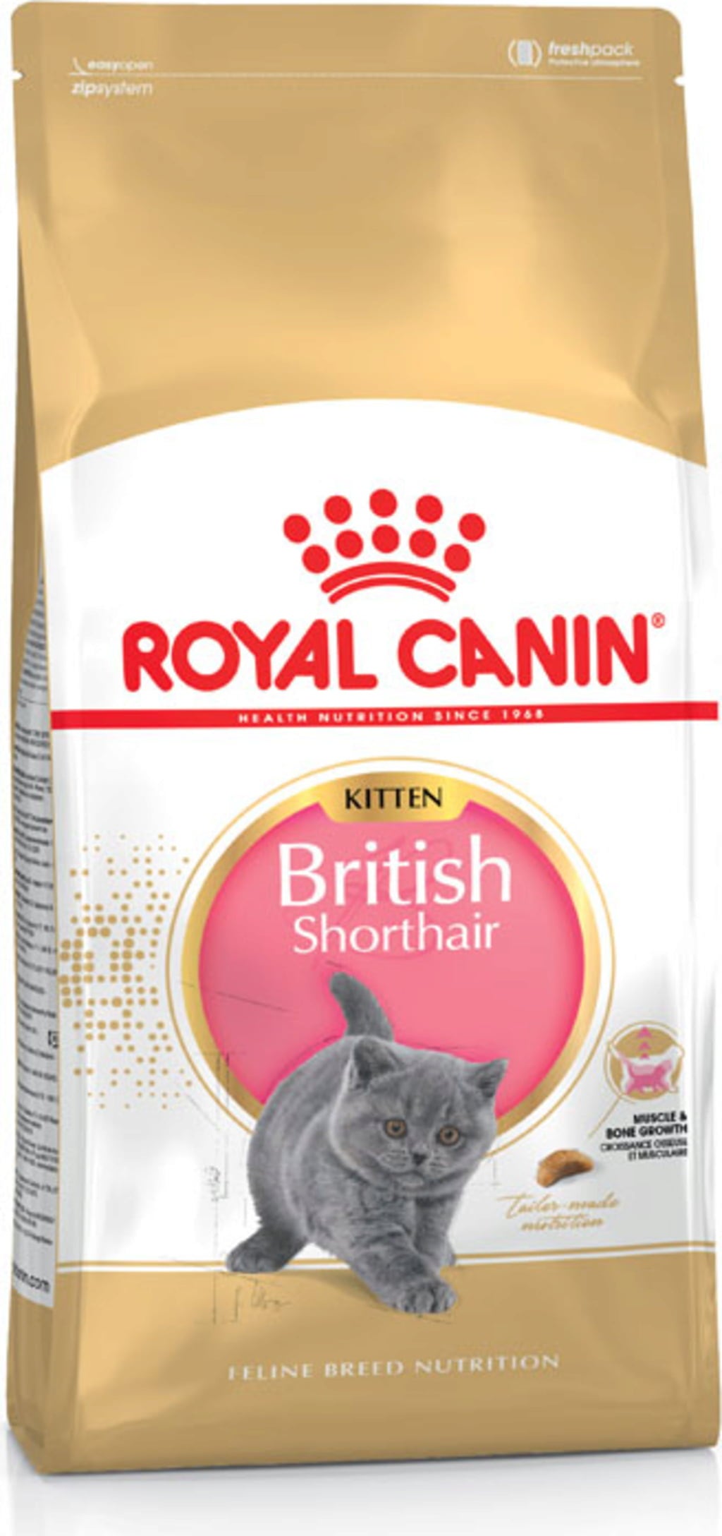 Because of this breed's placid nature and a tendency to gain weight, a specific diet and food rationing are key factors in your kitten's healthy growth. ROYAL CANIN® British Shorthair Kitten food has an adapted protein content, as well as precisely balanced vitamins and minerals to help support the development of healthy muscles and strong bones. While your kitten's immune system is still developing, it needs a little extra support from its diet.
