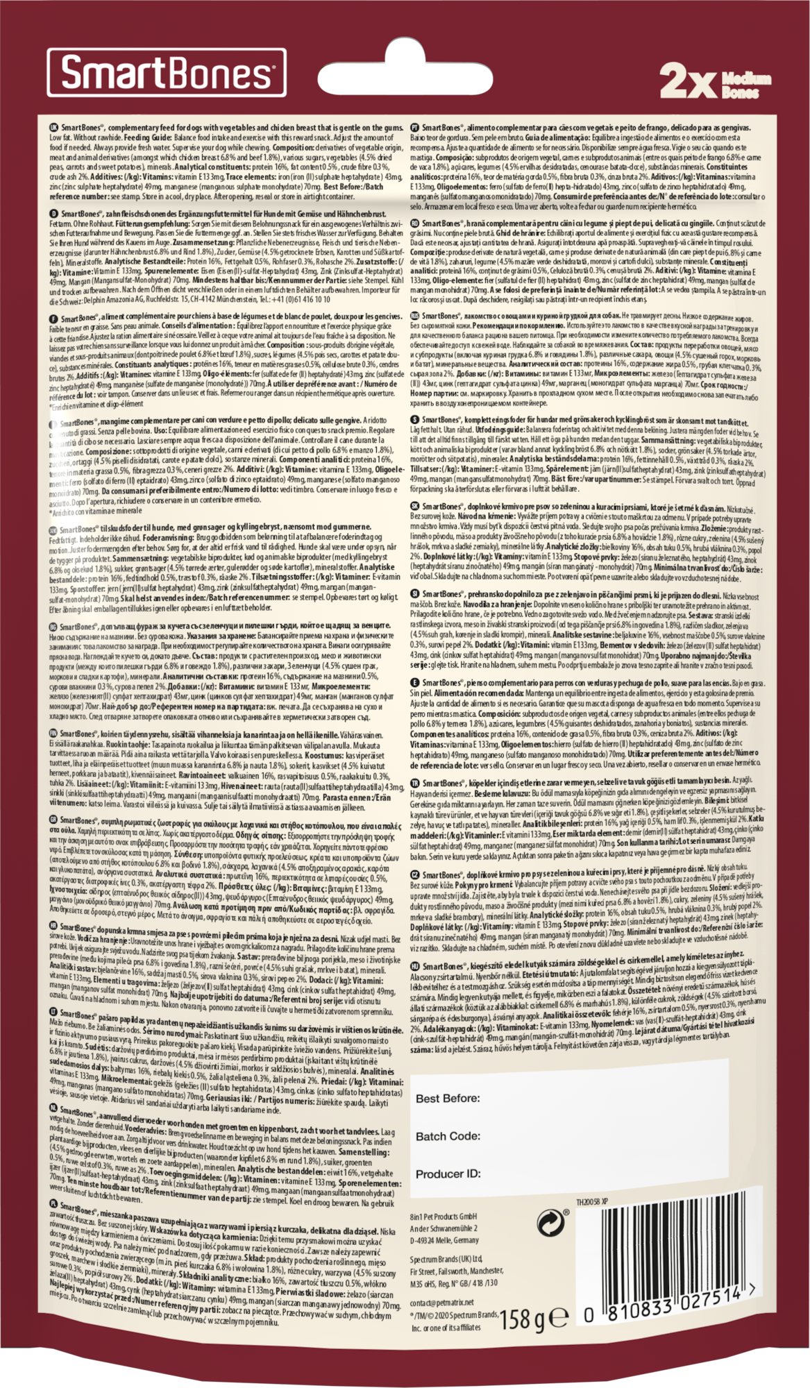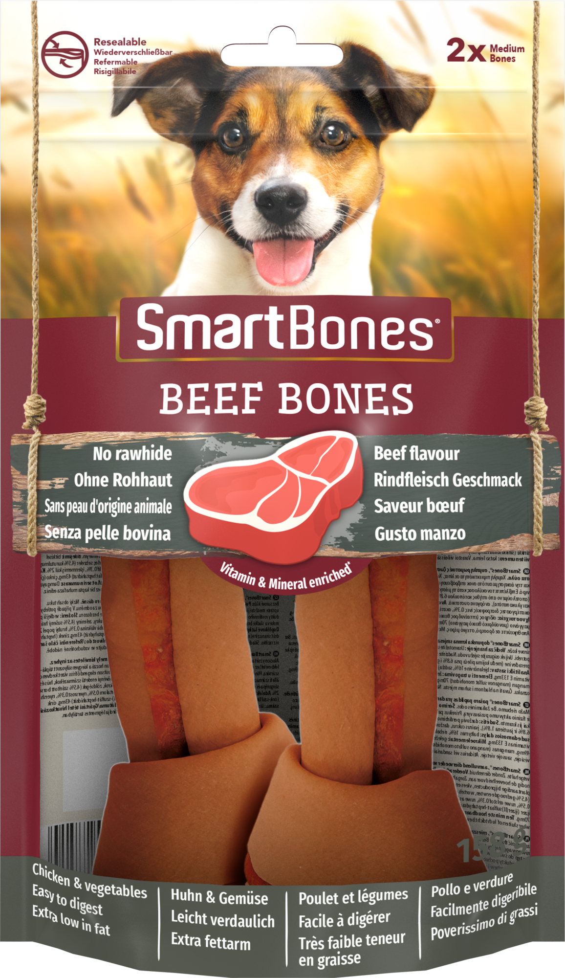 SmartBones' Beef Medium chew bones are a special treat made without rawhide and filled with delicious, high-quality ingredients. The bone is packed with tasty chicken meat on the inside, while the outer layer features nutritious, vegetable-based ingredients. A tempting beef flavour completes the irresistible taste. These chewy bones are rich in vitamin E and minerals, low in fat, and easily digestible, making them the perfect, healthy snack for your dog.