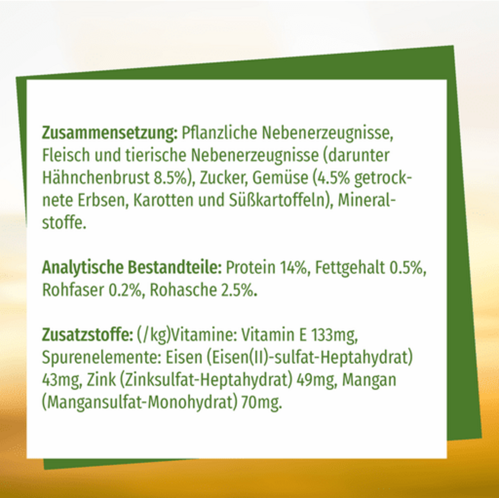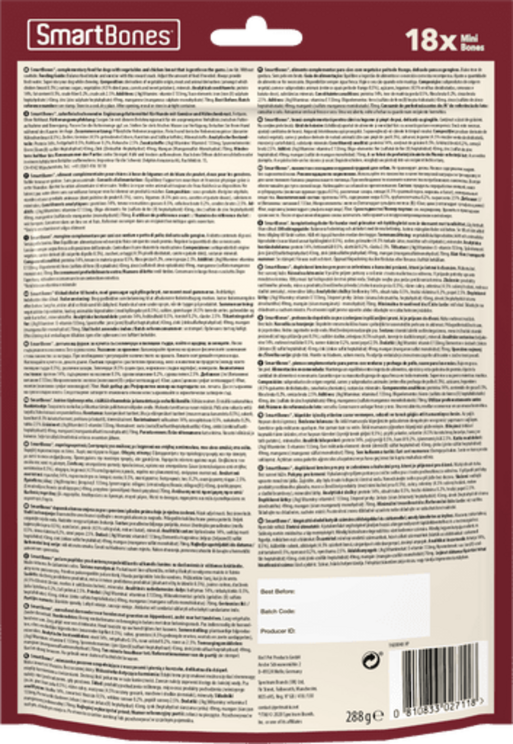 The Chicken Mini chew bones by SmartBones are tasty chew bones without rawhide but with a delicious "character": the delicious chicken meat inside the bone is coated with a layer of tasty vegetables such as peas, carrots and sweet potatoes. The low-fat and easily digestible chewy bones are enriched with vitamin E and other valuable minerals.