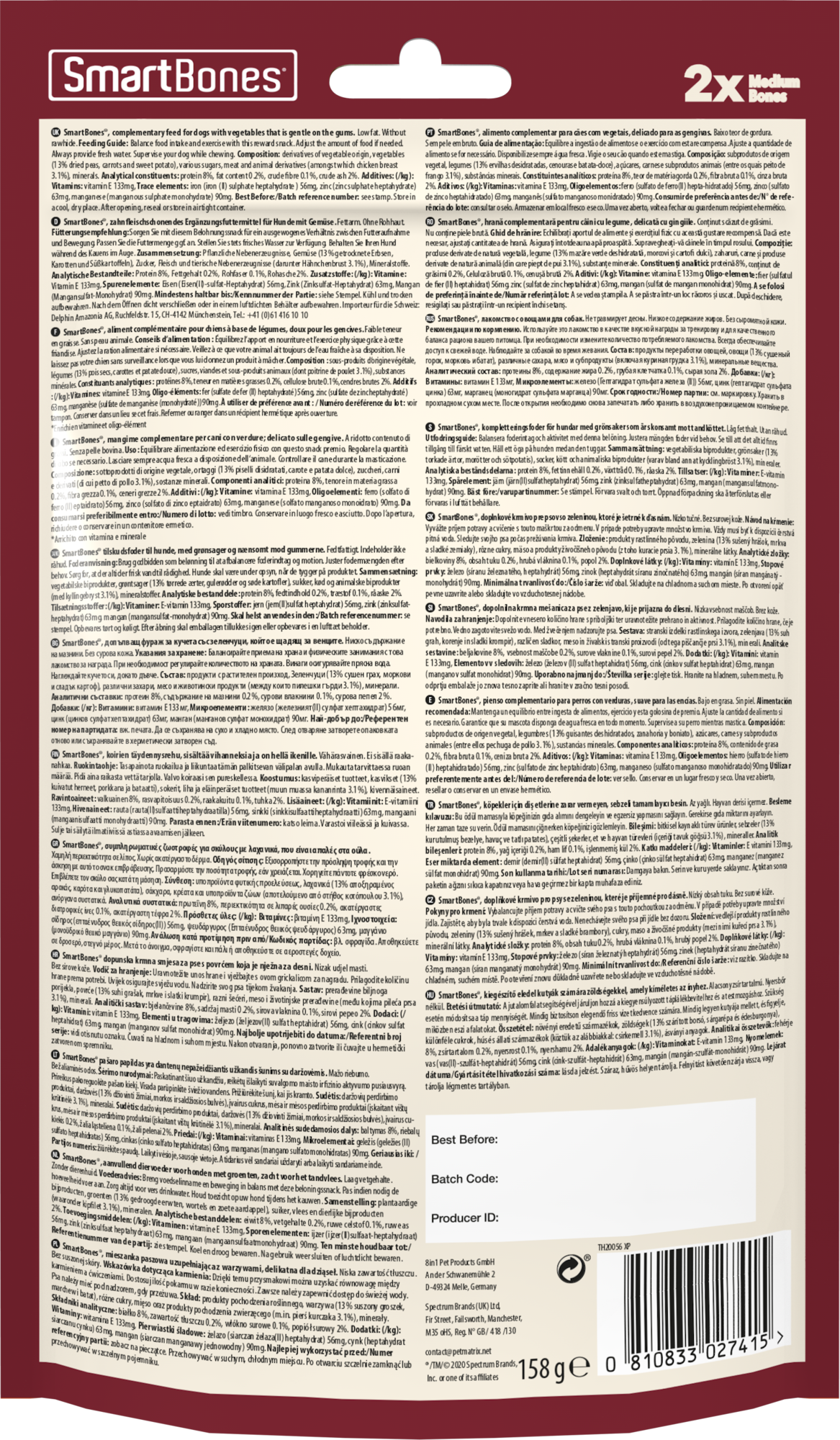 What is the furry friends' favourite thing to do? That's right - chew, chew, chew! The rawhide-free Sweet Potato Medium chew bones by SmartBones are a real treat! The inside of the chewy bone consists of delicious sweet potatoes, coated with a layer of vegetables such as peas and carrots. The snack is rich in vitamin E and other valuable minerals that are optimised for the needs of medium-sized dogs. The chew is extra low in fat and therefore easy to digest.
