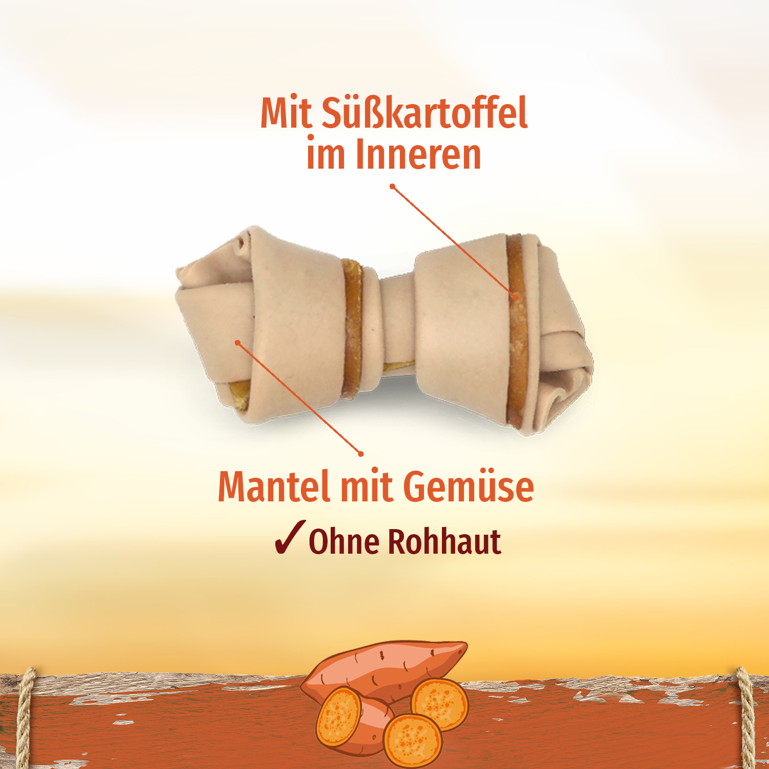 The reward snack with sweet potato not only provides hours of entertainment, it also supports the dental hygiene of your furry friend in a natural way: while your sweet furry friend chews on the bone, their teeth are mechanically abraded and dental plaque is effectively removed.