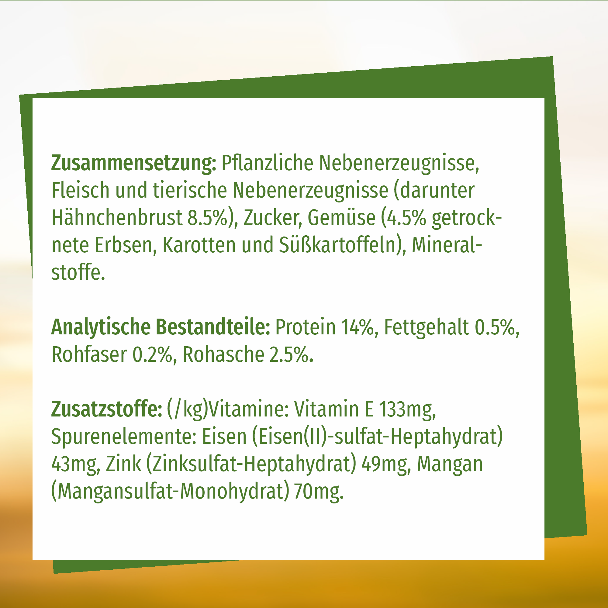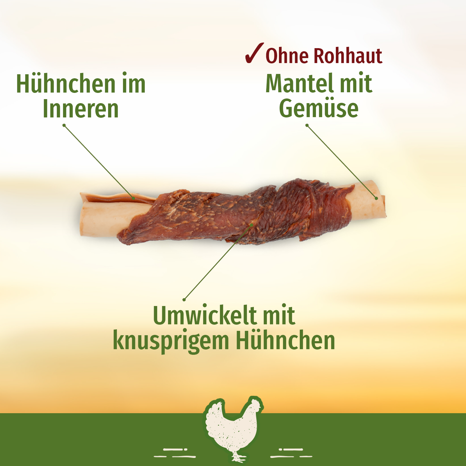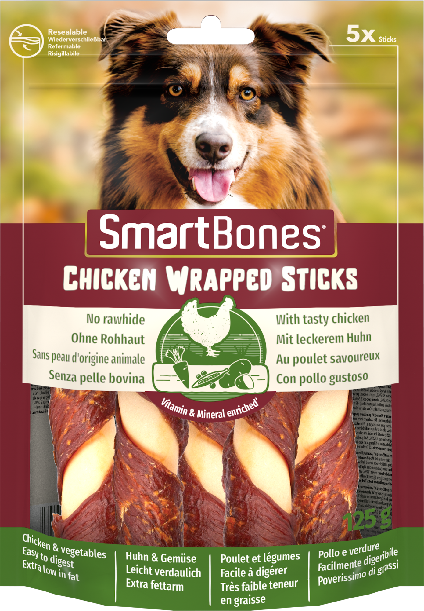 The tasty Chicken Wrapped chew sticks by SmartBones are particularly delicious. The inner layer consists of irresistible chicken meat wrapped in a layer of vegetables. A layer of crispy chicken provides an additional chewing effect. The extra low-fat and easily digestible chew sticks contain valuable vitamin E and high-quality minerals, which are tailored to the needs of dogs of all sizes.