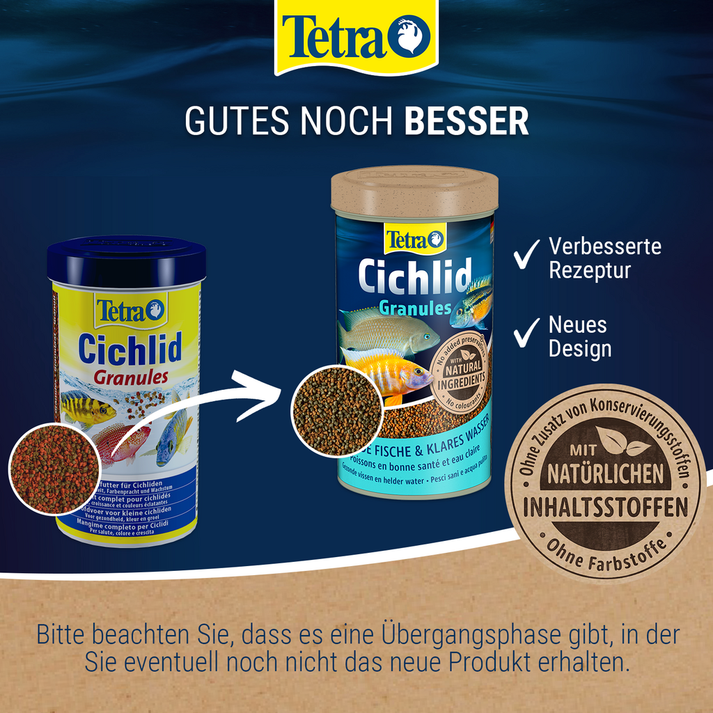 Tetra Cichlid Granules provide a balanced and healthy diet for cichlids. Thanks to the composition with two different granules, it offers a varied diet for all types of cichlids. The slowly sinking granules make it particularly suitable for cichlids that feed in the middle and lower water layers.