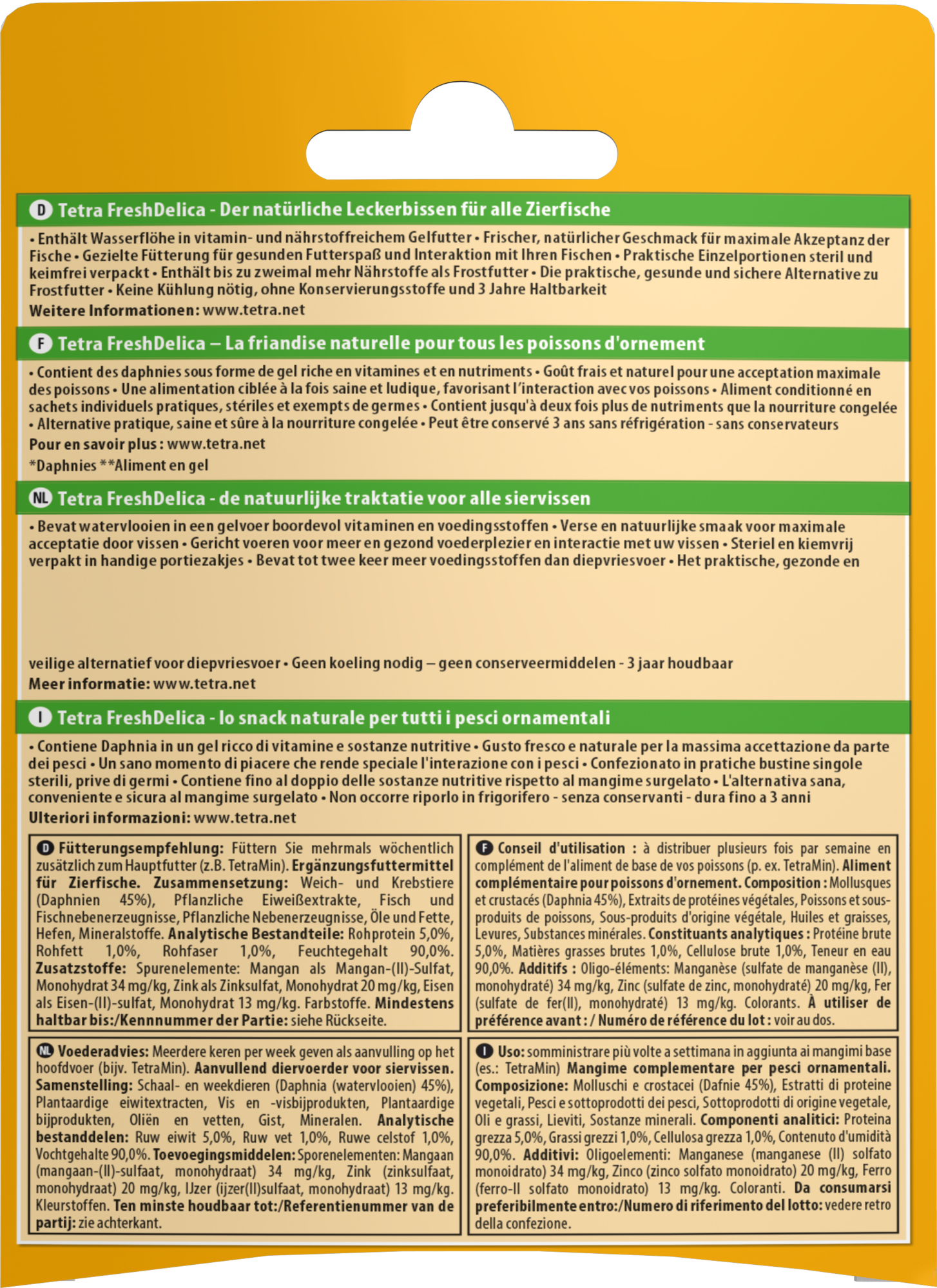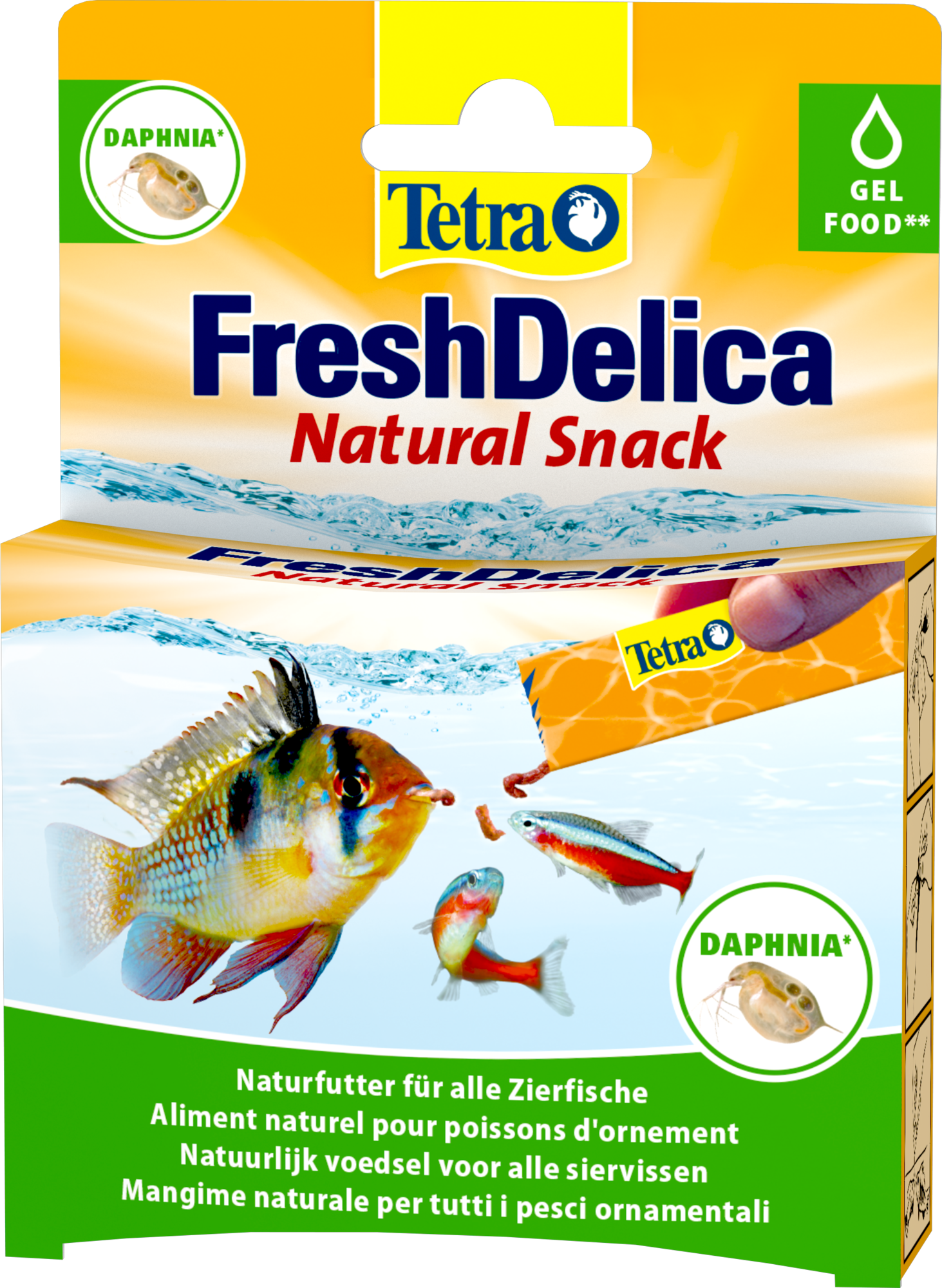 Tetra FreshDelica Daphnia is an innovative natural food in nutrient-rich jelly for all ornamental fish. The gel provides a natural, varied diet and healthy food fun and interaction with the fish. FreshDelica is the ideal supplementary feed to the main feed TetraMin. FreshDelica is a natural delicacy for all ornamental fish and contains natural aquatic animals in vitamin and nutrient-rich jelly food. The fresh, natural taste ensures maximum acceptance and is available in four different flavours: red mosquito larvae, shrimp, krill and water fleas. Fresh Delica contains up to twice more nutrients than frozen food!