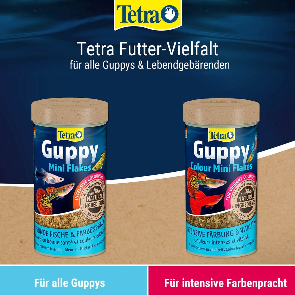 Tetra Guppy Colour Mini Flakes is a high-quality staple food in flake form for guppies and livebearing fish such as mollies, platies and swordtails.