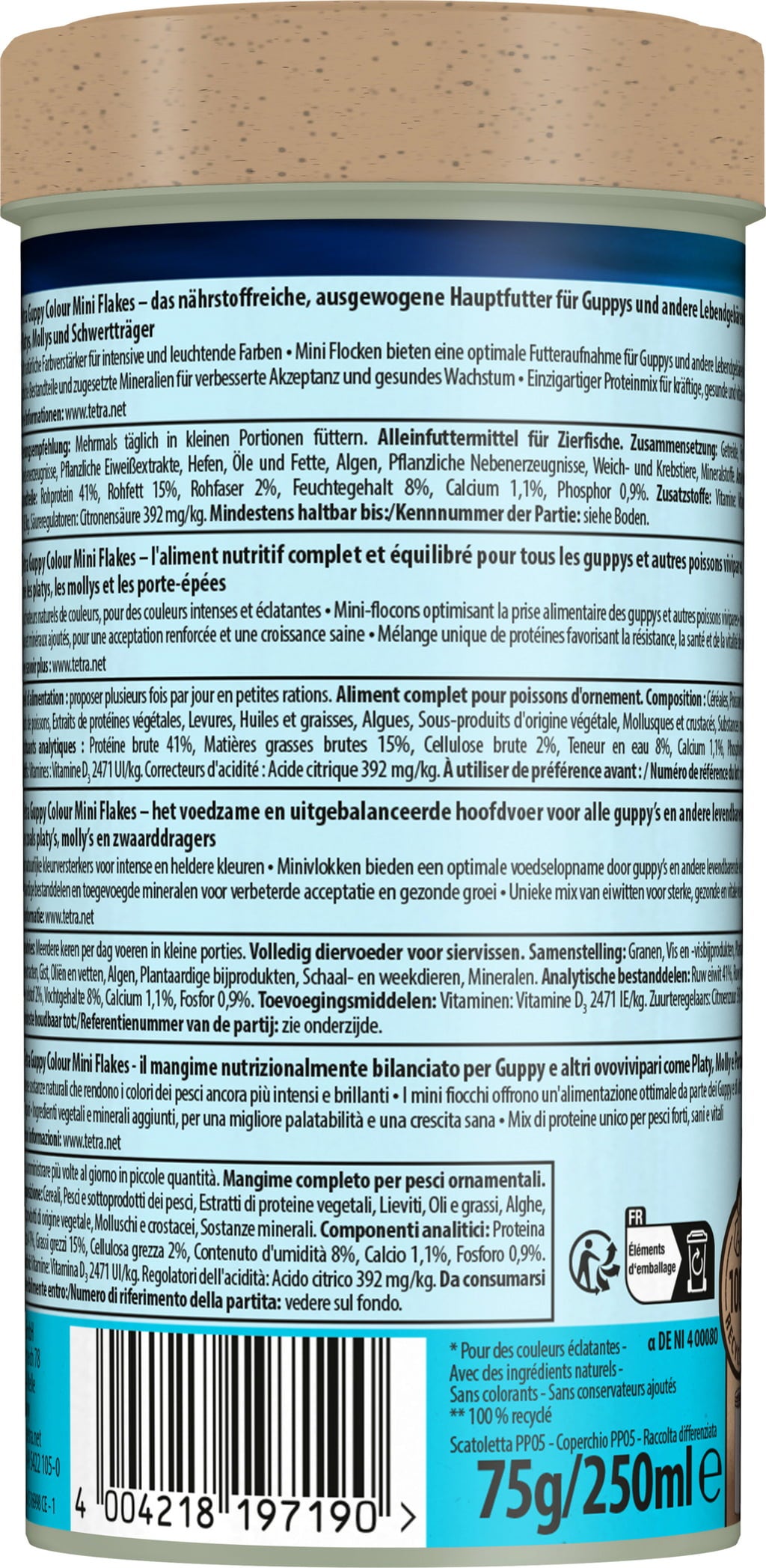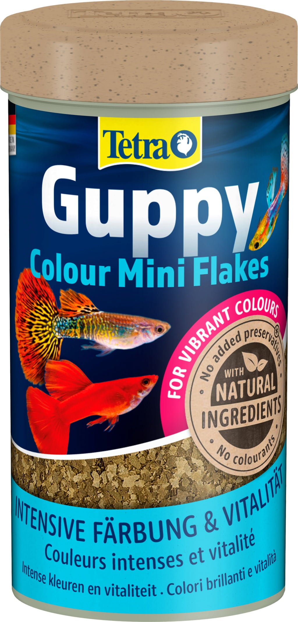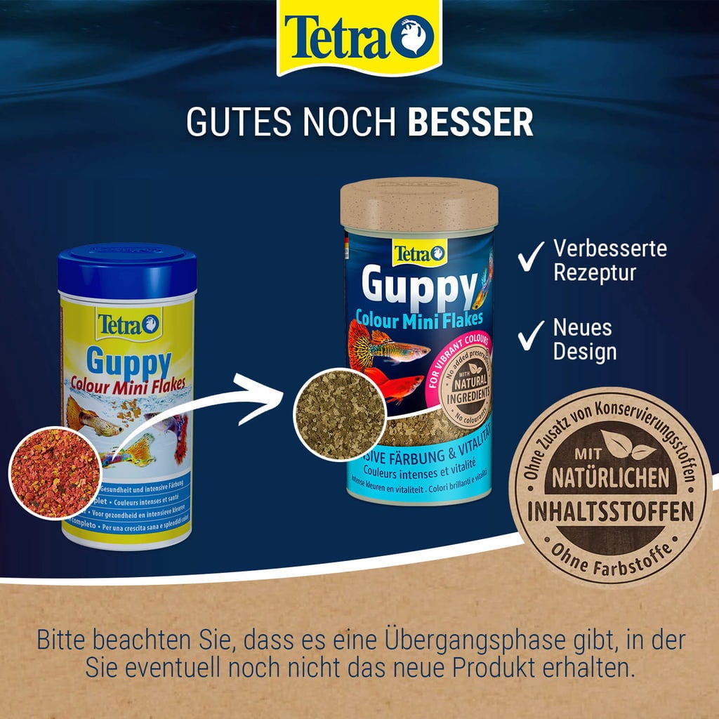 Tetra Guppy Colour Mini Flakes is a staple food for guppies and other viviparous fish. Its high content of natural colour enhancers promises vibrant colours. An optimal combination of nutrients with a high-quality protein mix with no colourants or added preservatives supports normal growth and immunity.