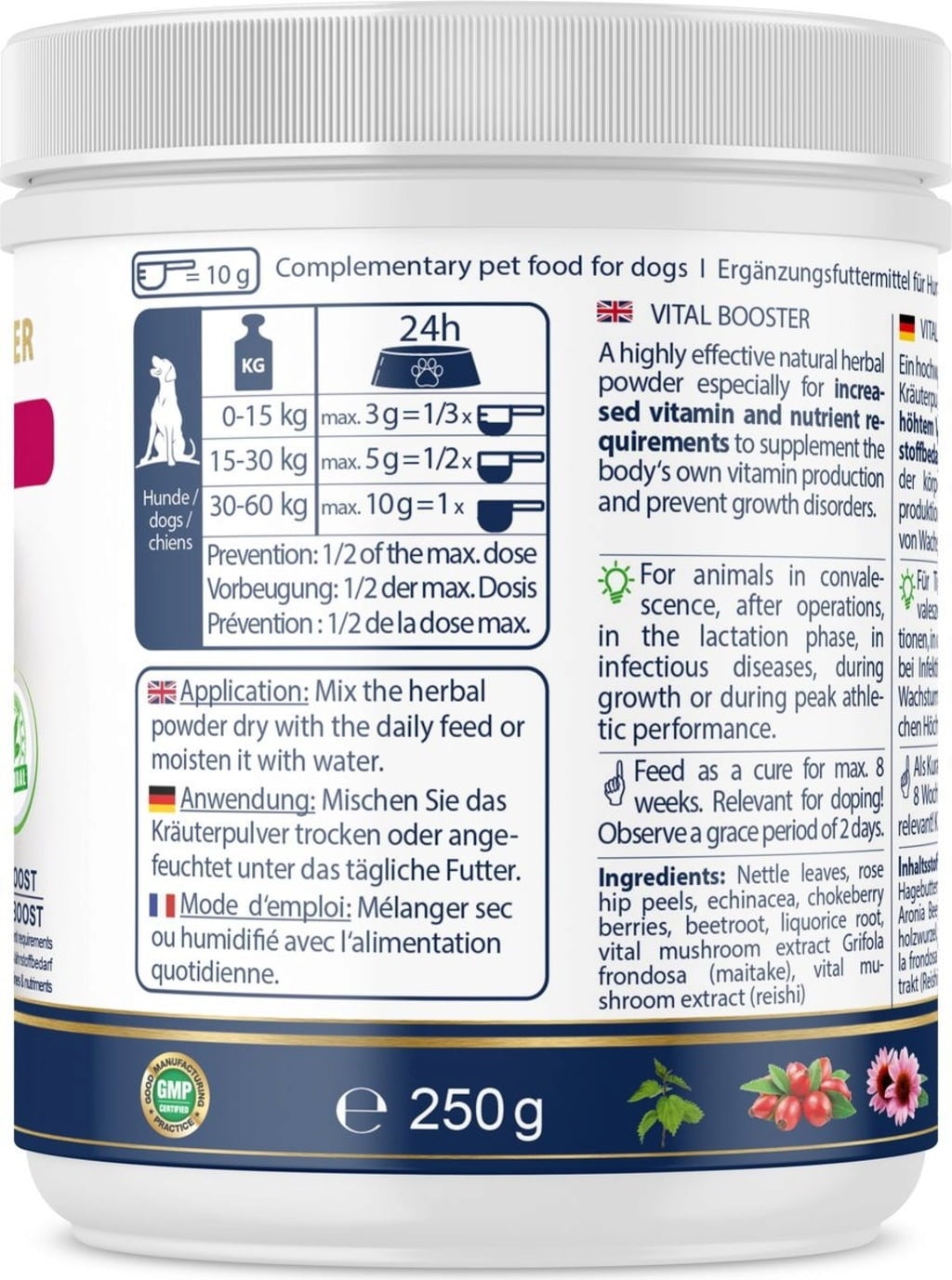 There are times when your darling needs extra vitamins and nutrients. The selected herbs and medicinal mushrooms in this mixture support the body's own vitamin production and can prevent growth disorders. The powder is a purely natural product without grain and reduced in strength.