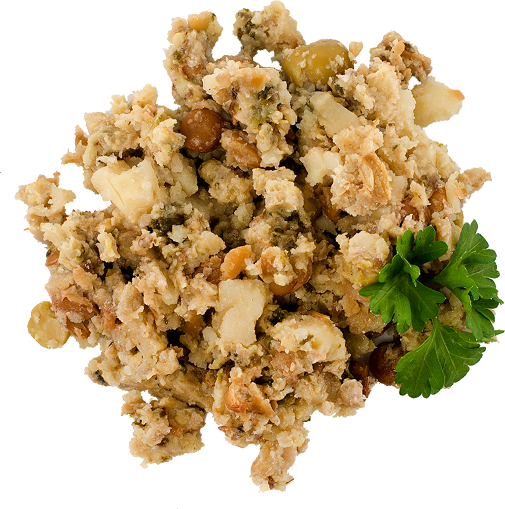 Potatoes, 12,1 % Millet, 11,2 % Lentils , Pea protein, 5,6 % Spinach, Pea protein powder, Safflower Oil, Lupine, Minerals, Peas, Sunflower seeds, 1,5 % Chia seeds, Algae, Herbs, Beer yeast