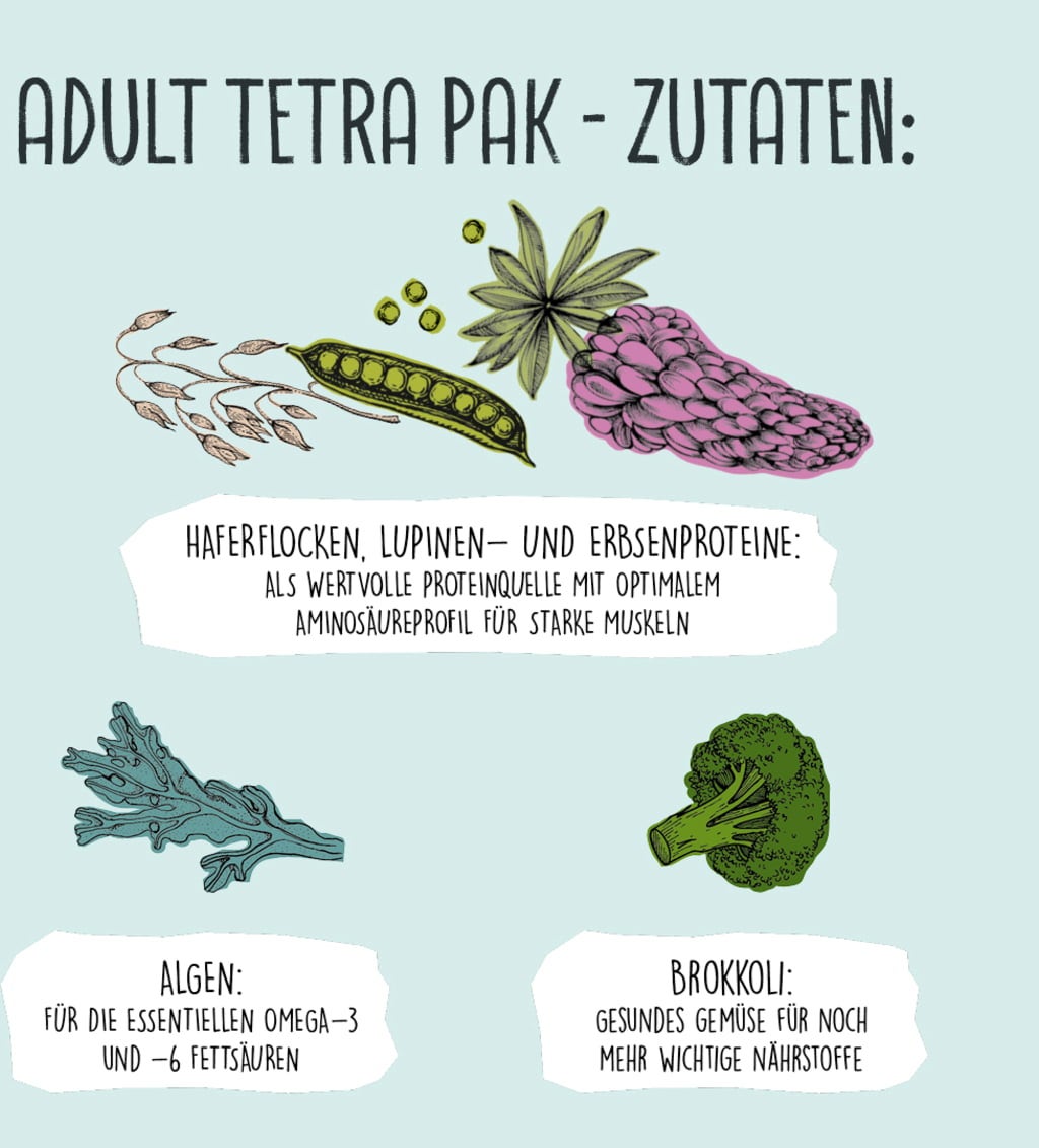 Potatoes, 13 % Gluten-free oat flakes, Pea protein, 7 % Broccoli, Rapeseed Oil, Lupine, Minerals, 3 % Peas, Sunflower seeds, 1,8 % Linseed, Algae, Herbs, Beer yeast