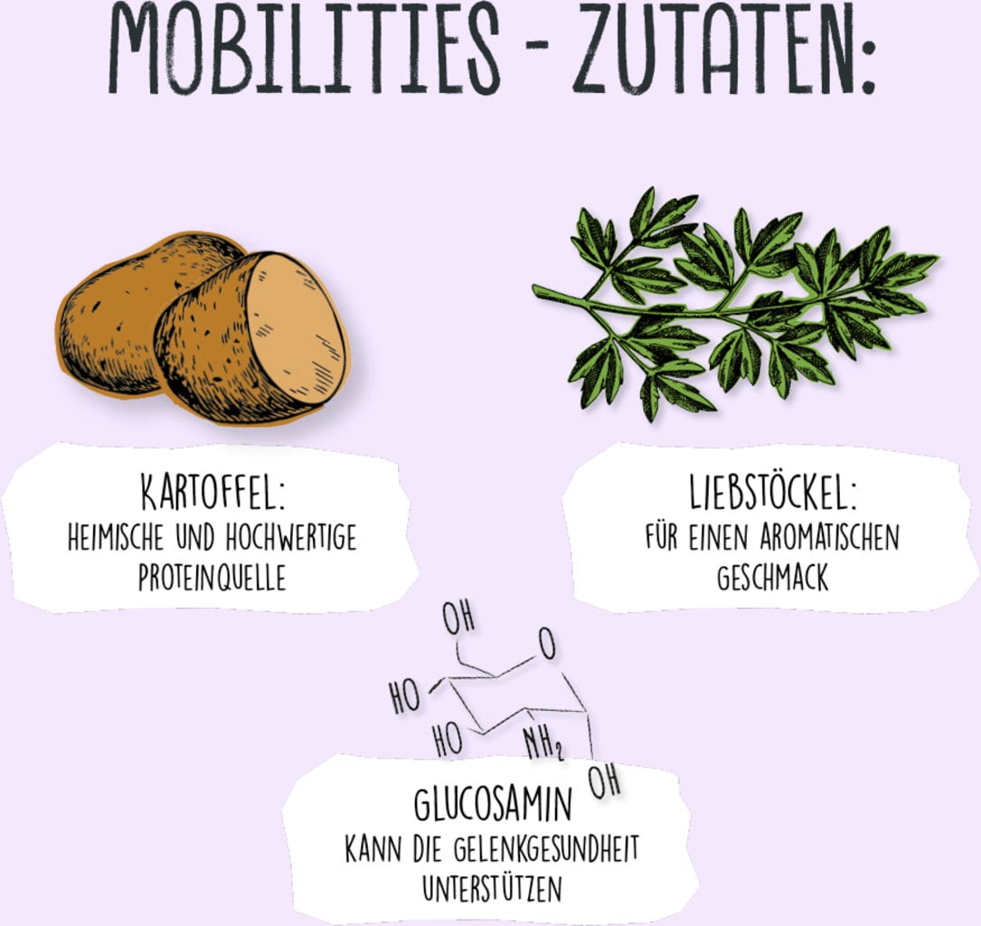 Potato flour, Glycerine, Potato starch, Cellulose, Potato protein, Beer yeast, Guar gum, 2 % Glucosamine, 0,5 % Lovage