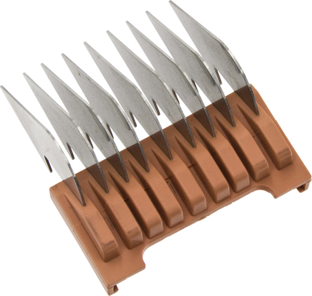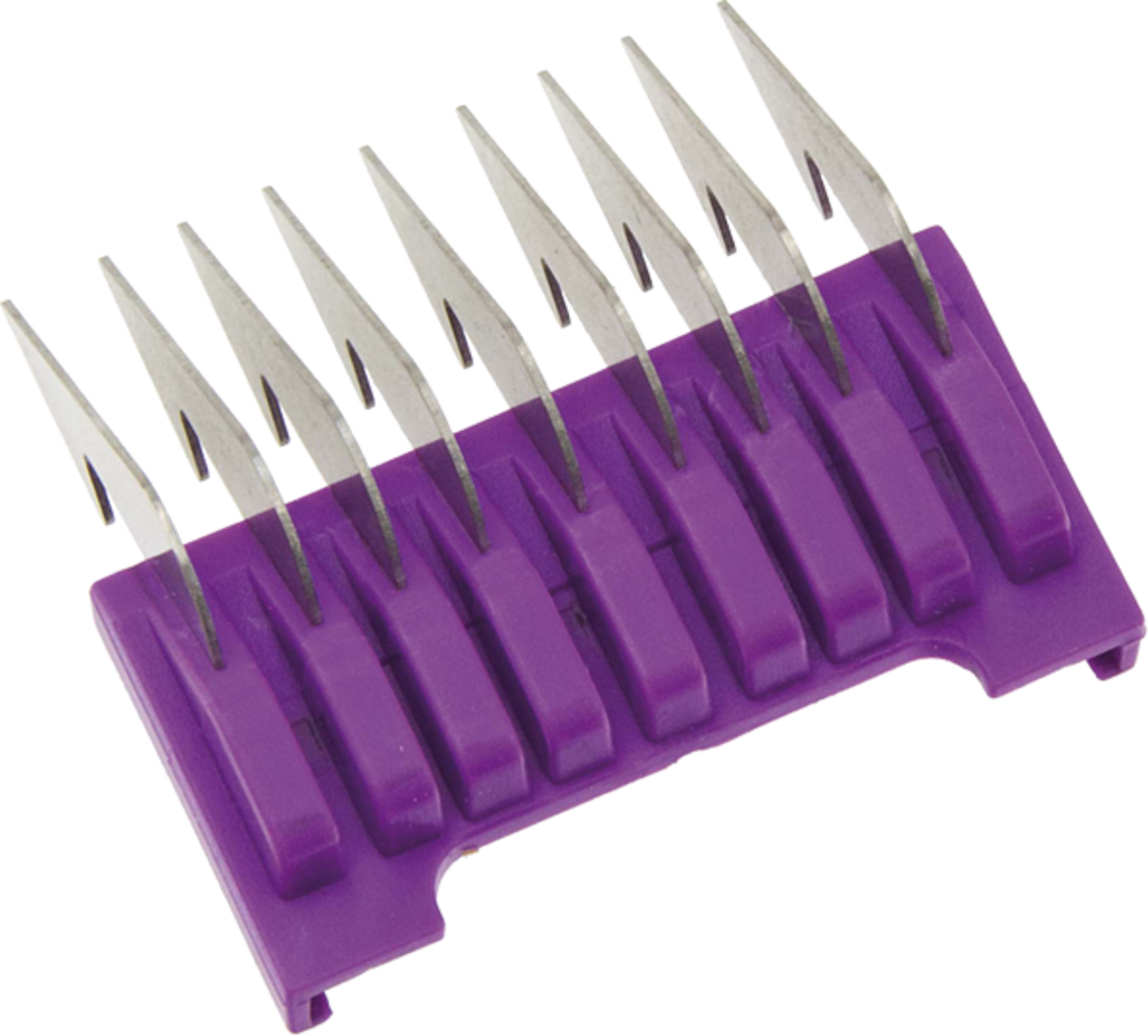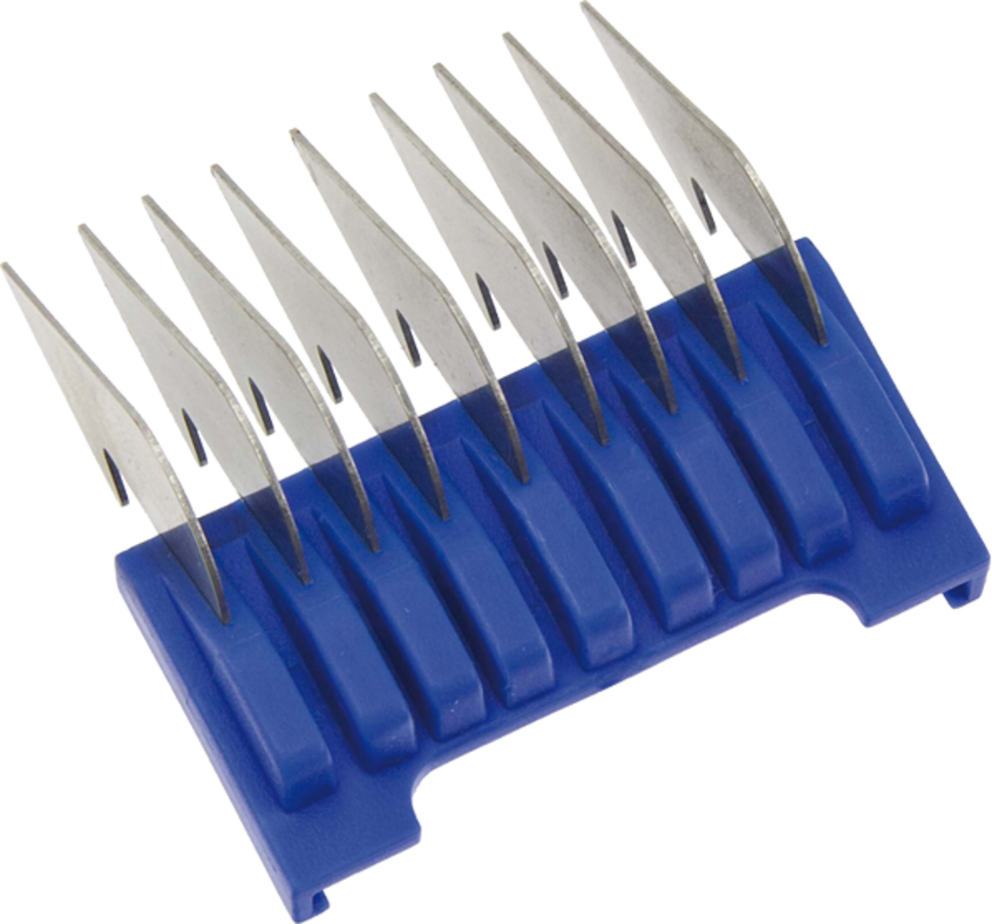 The slide-on combs have slender metal teeth that ensure excellent gliding properties. The material also ensures better dimensional stability and a more even shearing result compared to conventional plastic push-on combs. The colour coding makes it easier to identify the individual sizes.
