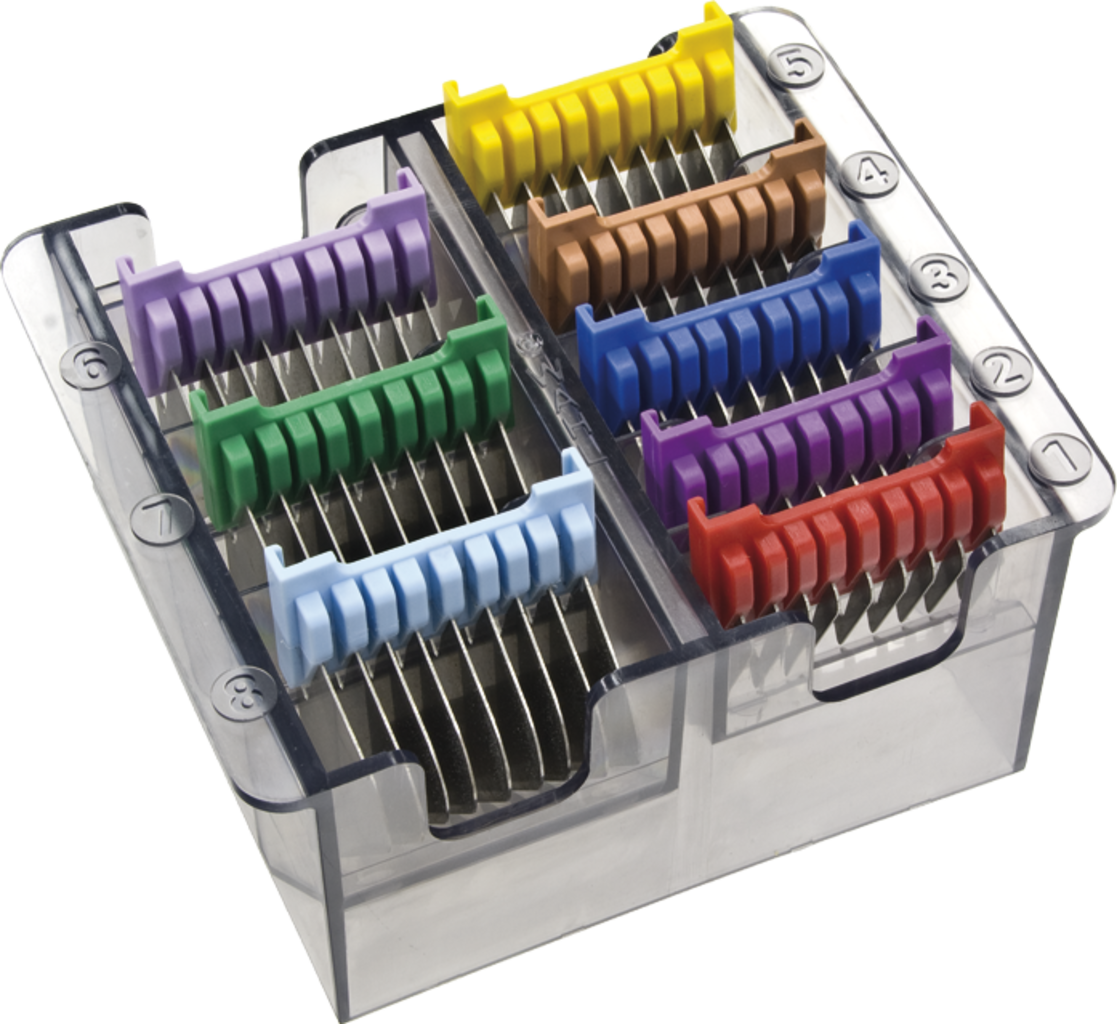 These colour-coded push-on combs make size identification quick and easy and come in a convenient storage box. Crafted with slim metal teeth, they offer exceptional glide for smooth, precise cutting. The durable material provides enhanced dimensional stability, delivering a more consistent and even cut compared to standard plastic combs.