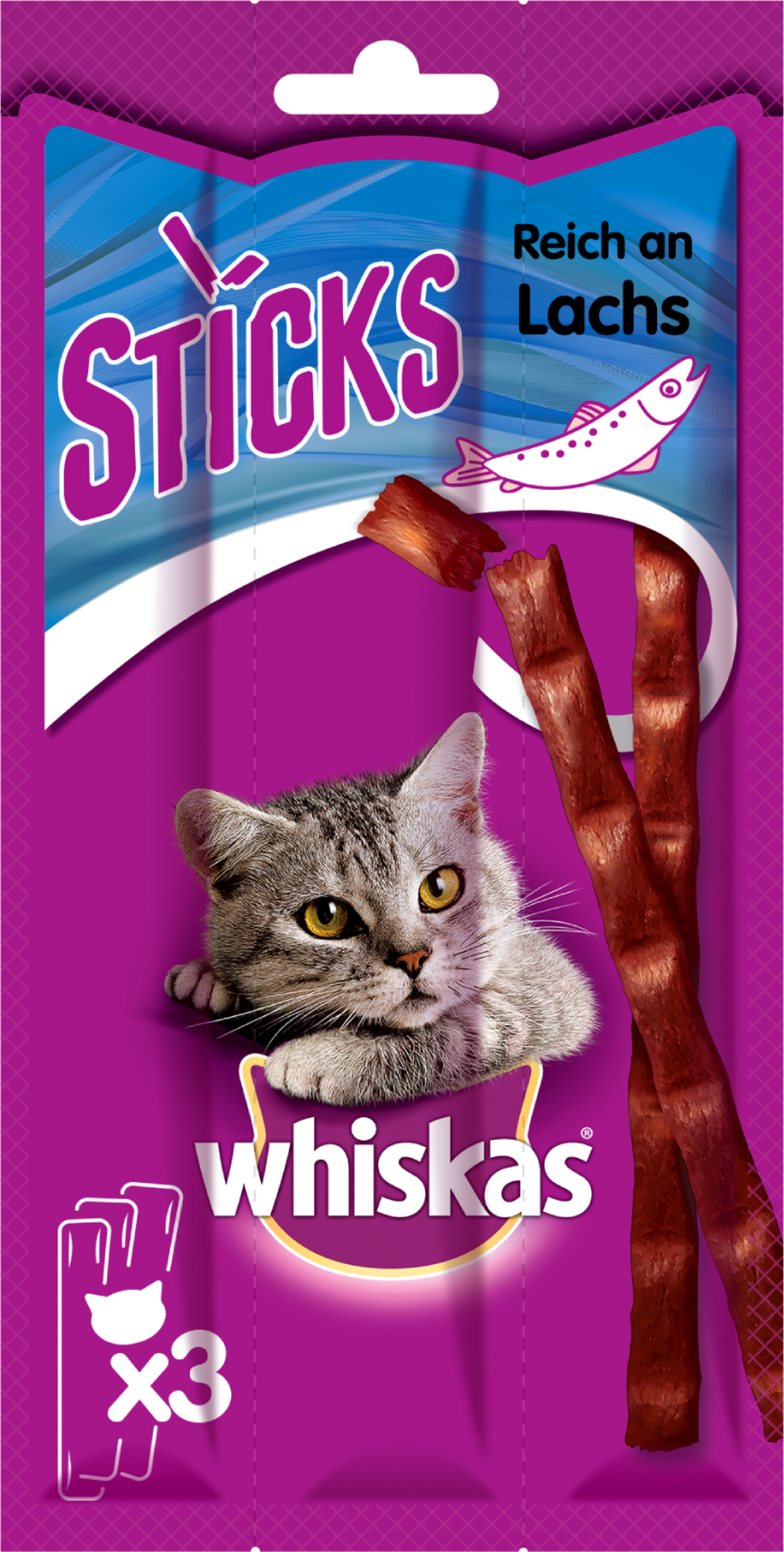 Whiskas Sticks are delicious cat treats without added colours or flavours. The perfect snack between meals, the sticks are rich in high omega-3 fatty acids which have a positive effect on the body and immune system.